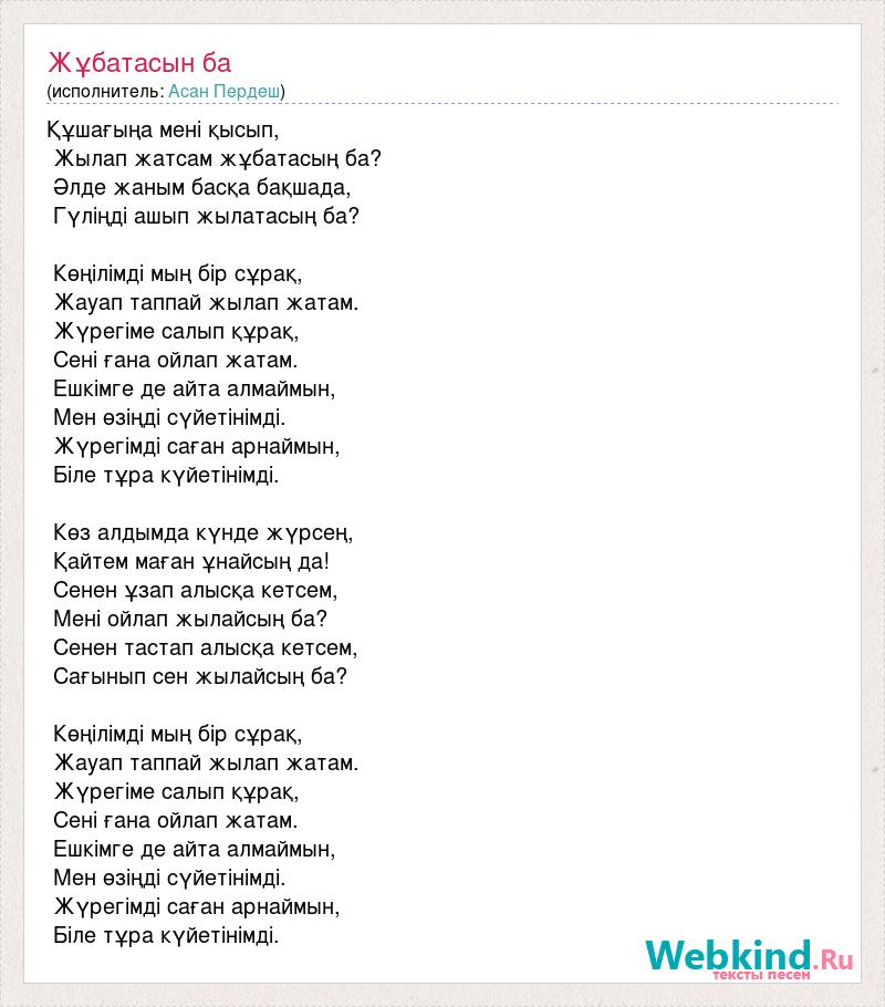 Құшағыңа мені қысып, Жылап жатсам жұбатасың ба? Әлде жаным басқа бақшада, Гүліңді ашып жылатасың ба? Көңілімді мың бір сұрақ, Жауап таппай жылап жатам. Жүрегіме салып құрақ, Сені ғана ойлап жатам. Ешкімге де айта алмаймын, Мен өзіңді сүйетінімді. Жүрегімді саған арнаймын, Біле тұра күйетінімді. Көз алдымда күнде жүрсең, Қайтем маған ұнайсың да! Сенен ұзап алысқа кетсем, Мені ойлап жылайсың ба? Сенен тастап алысқа кетсем, Сағынып сен жылайсың ба? Көңілімді мың бір сұрақ, Жауап таппай жылап жатам. Жүрегіме салып құрақ, Сені ғана ойлап жатам. Ешкімге де айта алмаймын, Мен өзіңді сүйетінімді. Жүрегімді саған арнаймын, Біле тұра күйетінімді.