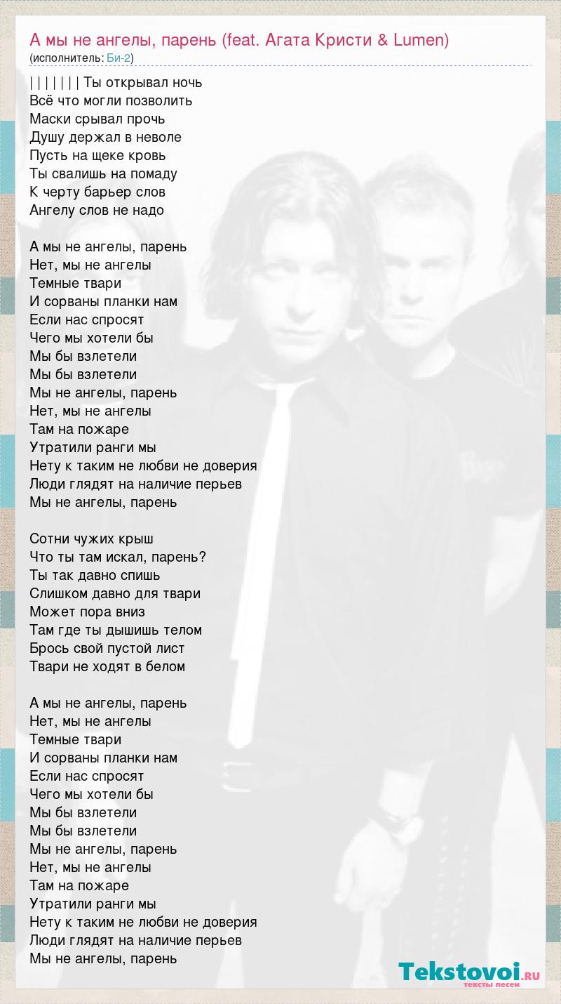 | | | | | | | Ты открывал ночь Всё что могли позволить Маски срывал прочь Душу держал в неволе Пусть на щеке кровь Ты свалишь на помаду К черту барьер слов Ангелу слов не надо А мы не ангелы, парень Нет, мы не ангелы Темные твари И сорваны планки нам Если нас спросят Чего мы хотели бы Мы бы взлетели Мы бы взлетели Мы не ангелы, парень Нет, мы не ангелы Там на пожаре Утратили ранги мы Нету к таким не любви не доверия Люди глядят на наличие перьев Мы не ангелы, парень Сотни чужих крыш Что ты там искал, парень? Ты так давно спишь Слишком давно для твари Может пора вниз Там где ты дышишь телом Брось свой пустой лист Твари не ходят в белом А мы не ангелы, парень Нет, мы не ангелы Темные твари И сорваны планки нам Если нас спросят Чего мы хотели бы Мы бы взлетели Мы бы взлетели Мы не ангелы, парень Нет, мы не ангелы Там на пожаре Утратили ранги мы Нету к таким не любви не доверия Люди глядят на наличие перьев Мы не ангелы, парень
