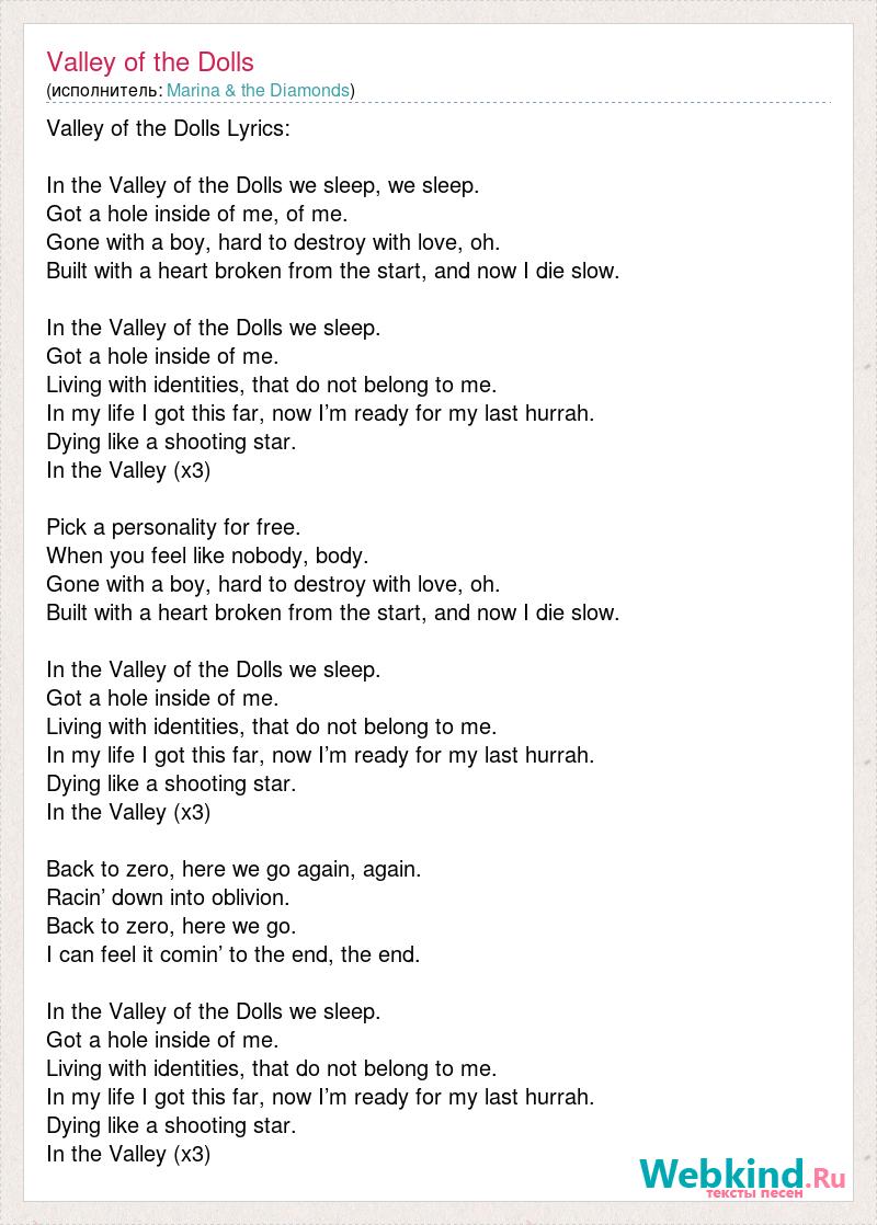 Valley of the Dolls Lyrics: In the Valley of the Dolls we sleep, we sleep. Got a hole inside of me, of me. Gone with a boy, hard to destroy with love, oh. Built with a heart broken from the start, and now I die slow. In the Valley of the Dolls we sleep. Got a hole inside of me. Living with identities, that do not belong to me. In my life I got this far, now I’m ready for my last hurrah. Dying like a shooting star. In the Valley (x3) Pick a personality for free. When you feel like nobody, body. Gone with a boy, hard to destroy with love, oh. Built with a heart broken from the start, and now I die slow. In the Valley of the Dolls we sleep. Got a hole inside of me. Living with identities, that do not belong to me. In my life I got this far, now I’m ready for my last hurrah. Dying like a shooting star. In the Valley (x3) Back to zero, here we go again, again. Racin’ down into oblivion. Back to zero, here we go. I can feel it comin’ to the end, the end. In the Valley of the Dolls we sleep. Got a hole inside of me. Living with identities, that do not belong to me. In my life I got this far, now I’m ready for my last hurrah. Dying like a shooting star. In the Valley (x3)