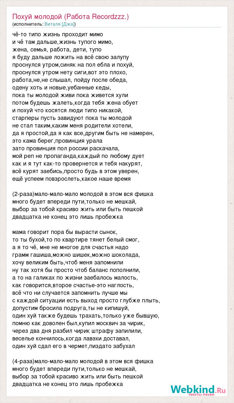 чё-то типо жизнь проходит мимо и чё там дальше,жизнь тупого мимо, жена, семья, работа, дети, тупо я буду дальше ложить на всё свою залупу проснулся утром,синяк на пол ебла и похуй, проснулся утром нету сиги,вот это плохо, работа,не,не слышал, пойду после обеда, одену хоть и новые,уебанные кеды, пока ты молодой живи пока живется хули потом будешь жалеть,когда тебя жена обует и похуй что косятся люди типо никакой, старперы пусть завидуют пока ты молодой не стал таким,каким меня родители хотели, да я простой,да я как все,другим быть не намерен, это кама берег,провинция урала зато провинция пол россии раскачала, мой реп не пропаганда,каждый по любому дует как и я тут как-то провернется и тебя накурят, всё курят заебись,просто будь в этом уверен, ещё успеем повзрослеть,какое наше время (2-раза)мало-мало-мало молодой в этом вся фишка много будет впереди пути,только не мешкай, выбор за тобой красиво жить или быть пешкой двадцатка не конец это лишь пробежка мама говорит пора бы вырасти сынок, то ты бухой,то по квартире тянет белый смог, а я то чё, мне не многое для счастья надо грамм гашиша,можно шишек,можно шоколада, хочу великим быть,чтоб меня запомнили ну так хотя бы просто чтоб баланс пополнили, а то на галиках по жизни заебалось малость, как говорится,второе счастье-это наглость, всё что ни случается запомнить лучше мы с каждой ситуации есть выход просто глубже плыть, допустим бросила подруга,ты не кипишуй, один хуй также будешь трахать,только уже бывшую, помню как доволен был,купил москвич за чирик, через два дня разбил чирик штрафу запилили, веселье кончилось,когда лавэхи доставал, один хуй сдал его в чермет,пиздато забухал (4-раза)мало-мало-мало молодой в этом вся фишка много будет впереди пути,только не мешкай, выбор за тобой красиво жить или быть пешкой двадцатка не конец это лишь пробежка