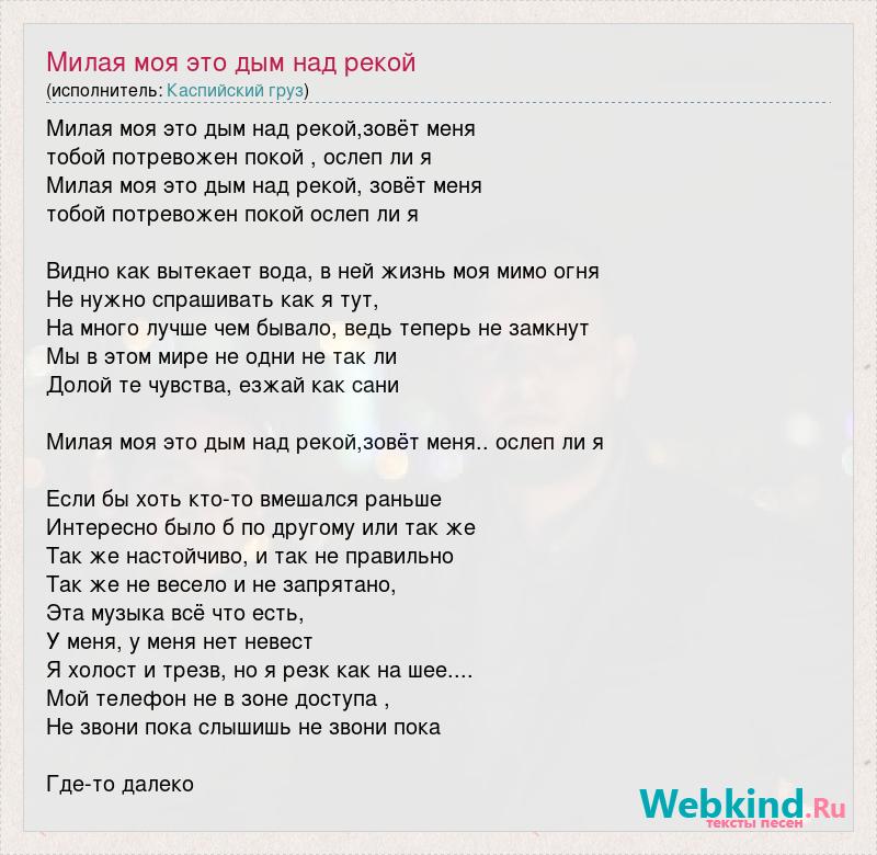Милая моя это дым над рекой,зовёт меня тобой потревожен покой , ослеп ли я Милая моя это дым над рекой, зовёт меня тобой потревожен покой ослеп ли я Видно как вытекает вода, в ней жизнь моя мимо огня Не нужно спрашивать как я тут, На много лучше чем бывало, ведь теперь не замкнут Мы в этом мире не одни не так ли Долой те чувства, езжай как сани Милая моя это дым над рекой,зовёт меня.. ослеп ли я Если бы хоть кто-то вмешался раньше Интересно было б по другому или так же Так же настойчиво, и так не правильно Так же не весело и не запрятано, Эта музыка всё что есть, У меня, у меня нет невест Я холост и трезв, но я резк как на шее.... Мой телефон не в зоне доступа , Не звони пока слышишь не звони пока Где-то далеко