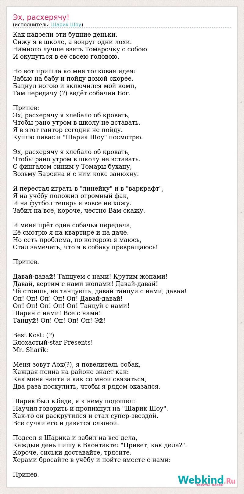 Как надоели эти будние деньки. Сижу я в школе, а вокруг одни лохи. Намного лучше взять Томарочку с собою И окунуться в её своею головою. Но вот пришла ко мне толковая идея: Забью на бабу и пойду домой скорее. Бацнул ногою и включился мой комп, Там передачу (?) ведёт собачий Бог. Припев: Эх, расхерячу я хлебало об кровать, Чтобы рано утром в школу не вставать. Я в этот гантор сегодня не пойду. Куплю пивас и "Шарик Шоу" посмотрю. Эх, расхерячу я хлебало об кровать, Чтобы рано утром в школу не вставать. С фингалом синим у Томары бухану, Возьму Барсяна и с ним кокс занюхну. Я перестал играть в "линейку" и в "варкрафт", Я на учёбу положил огромный фак, И на футбол теперь я вовсе не хожу. Забил на все, короче, честно Вам скажу. И меня прёт одна собачья передача, Её смотрю я на квартире и на даче. Но есть проблема, по которою я маюсь, Стал замечать, что я в собаку превращаюсь! Припев. Давай-давай! Танцуем с нами! Крутим жопами! Давай, вертим с нами жопами! Давай-давай! Чё стоишь, не танцуешь, давай танцуй с нами, давай! Оп! Оп! Оп! Оп! Оп! Давай-давай! Оп! Оп! Оп! Оп! Оп! Танцуй с нами! Шарян с нами! Все с нами! Танцуй! Оп! Оп! Оп! Оп! Эй! Best Kost: (?) Блохастый-star Presents! Mr. Sharik: Меня зовут Аок(?), я повелитель собак, Каждая псина на районе знает как: Как меня найти и как со мной связаться, Два раза поскулить, чтобы я рядом оказался. Шарик был в беде, я к нему подошел: Научил говорить и пропихнул на "Шарик Шоу". Как-то он раскрутился и стал супер-звездой. Все сучки его и давятся слюной. Подсел я Шарика и забил на все дела, Каждый день пишу в Вконтакте: "Привет, как дела?". Короче, сиськи доставайте, трясите. Херами бросайте в учёбу и пойте вместе с нами: Припев.