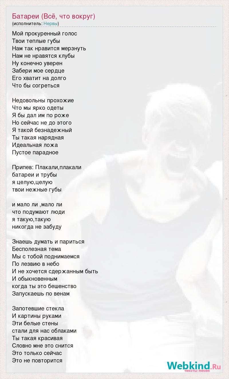 Мой прокуренный голос Твои теплые губы Нам так нравится мерзнуть Нам не нравятся клубы Ну конечно уверен Забери мое сердце Его хватит на долго Что бы согреться Недовольны прохожие Что мы ярко одеты Я бы дал им по роже Но сейчас не до этого Я такой безнадежный Ты такая нарядная Идеальная ложа Пустое парадное Припев: Плакали,плакали батареи и трубы я целую,целую твои нежные губы и мало ли ,мало ли что подумают люди я такую,такую никогда не забуду Знаешь думать и париться Бесполезная тема Мы с тобой поднимаемся По лезвию в небо И не хочется сдержанным быть И обыкновенным когда ты это бешенство Запускаешь по венам Запотевшие стекла И картины руками Эти белые стены стали для нас облаками Ты такая красивая Словно мне это снится Это только сейчас Это не повторится