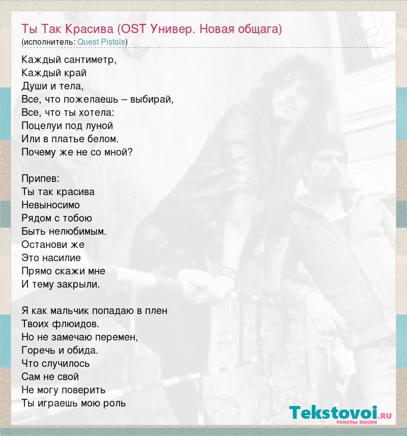 Каждый сантиметр, Каждый край Души и тела, Все, что пожелаешь – выбирай, Все, что ты хотела: Поцелуи под луной Или в платье белом. Почему же не со мной? Припев: Ты так красива Невыносимо Рядом с тобою Быть нелюбимым. Останови же Это насилие Прямо скажи мне И тему закрыли. Я как мальчик попадаю в плен Твоих флюидов. Но не замечаю перемен, Горечь и обида. Что случилось Сам не свой Не могу поверить Ты играешь мою роль
