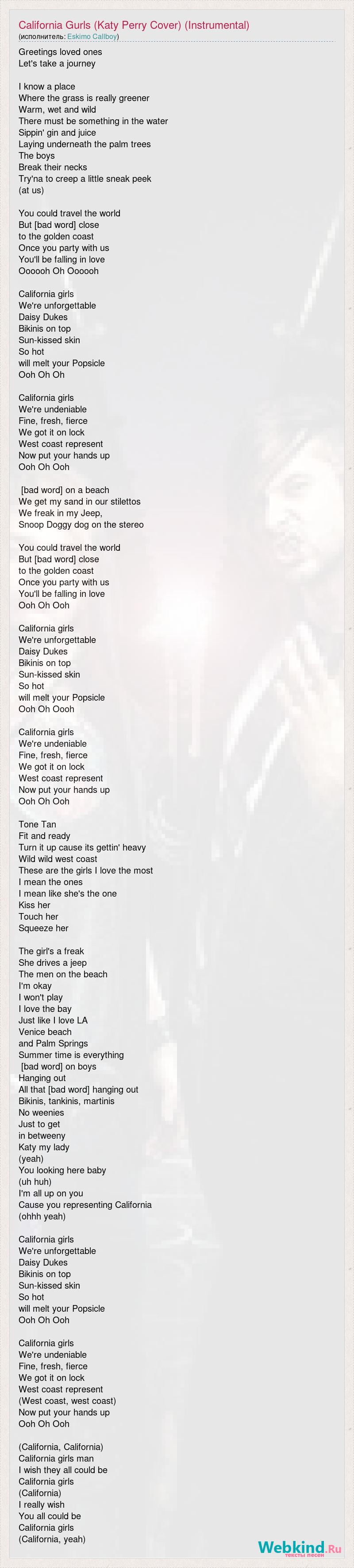 Greetings loved ones Let's take a journey I know a place Where the grass is really greener Warm, wet and wild There must be something in the water Sippin' gin and juice Laying underneath the palm trees The boys Break their necks Try'na to creep a little sneak peek (at us) You could travel the world But [bad word] close to the golden coast Once you party with us You'll be falling in love Oooooh Oh Oooooh California girls We're unforgettable Daisy Dukes Bikinis on top Sun-kissed skin So hot will melt your Popsicle Ooh Oh Oh California girls We're undeniable Fine, fresh, fierce We got it on lock West coast represent Now put your hands up Ooh Oh Ooh [bad word] on a beach We get my sand in our stilettos We freak in my Jeep, Snoop Doggy dog on the stereo You could travel the world But [bad word] close to the golden coast Once you party with us You'll be falling in love Ooh Oh Ooh California girls We're unforgettable Daisy Dukes Bikinis on top Sun-kissed skin So hot will melt your Popsicle Ooh Oh Oooh California girls We're undeniable Fine, fresh, fierce We got it on lock West coast represent Now put your hands up Ooh Oh Ooh Tone Tan Fit and ready Turn it up cause its gettin' heavy Wild wild west coast These are the girls I love the most I mean the ones I mean like she's the one Kiss her Touch her Squeeze her The girl's a freak She drives a jeep The men on the beach I'm okay I won't play I love the bay Just like I love LA Venice beach and Palm Springs Summer time is everything [bad word] on boys Hanging out All that [bad word] hanging out Bikinis, tankinis, martinis No weenies Just to get in betweeny Katy my lady (yeah) You looking here baby (uh huh) I'm all up on you Cause you representing California (ohhh yeah) California girls We're unforgettable Daisy Dukes Bikinis on top Sun-kissed skin So hot will melt your Popsicle Ooh Oh Ooh California girls We're undeniable Fine, fresh, fierce We got it on lock West coast represent (West coast, west coast) Now put your hands up Ooh Oh Ooh (California, California) California girls man I wish they all could be California girls (California) I really wish You all could be California girls (California, yeah)