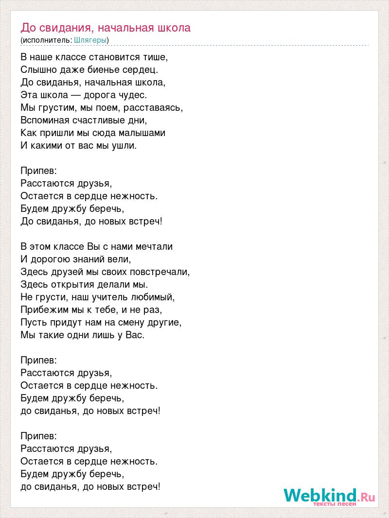 В наше классе становится тише, Слышно даже биенье сердец. До свиданья, начальная школа, Эта школа — дорога чудес. Мы грустим, мы поем, расставаясь, Вспоминая счастливые дни, Как пришли мы сюда малышами И какими от вас мы ушли. Припев: Расстаются друзья, Остается в сердце нежность. Будем дружбу беречь, До свиданья, до новых встреч! В этом классе Вы с нами мечтали И дорогою знаний вели, Здесь друзей мы своих повстречали, Здесь открытия делали мы. Не грусти, наш учитель любимый, Прибежим мы к тебе, и не раз, Пусть придут нам на смену другие, Мы такие одни лишь у Вас. Припев: Расстаются друзья, Остается в сердце нежность. Будем дружбу беречь, до свиданья, до новых встреч! Припев: Расстаются друзья, Остается в сердце нежность. Будем дружбу беречь, до свиданья, до новых встреч!