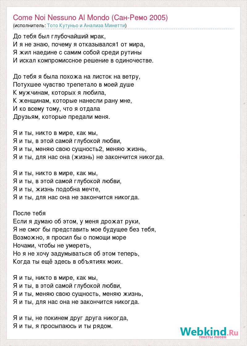 А как ты думаешь, о чем песня "Come Noi Nessuno Al Mondo (Сан-Ремо 2005)" ?