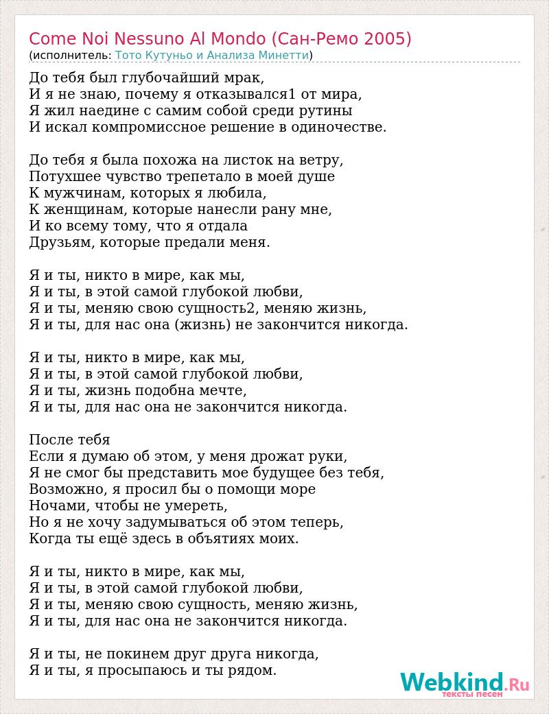 А как ты думаешь, о чем песня "Come Noi Nessuno Al Mondo (Сан-Ремо 2005)" ?