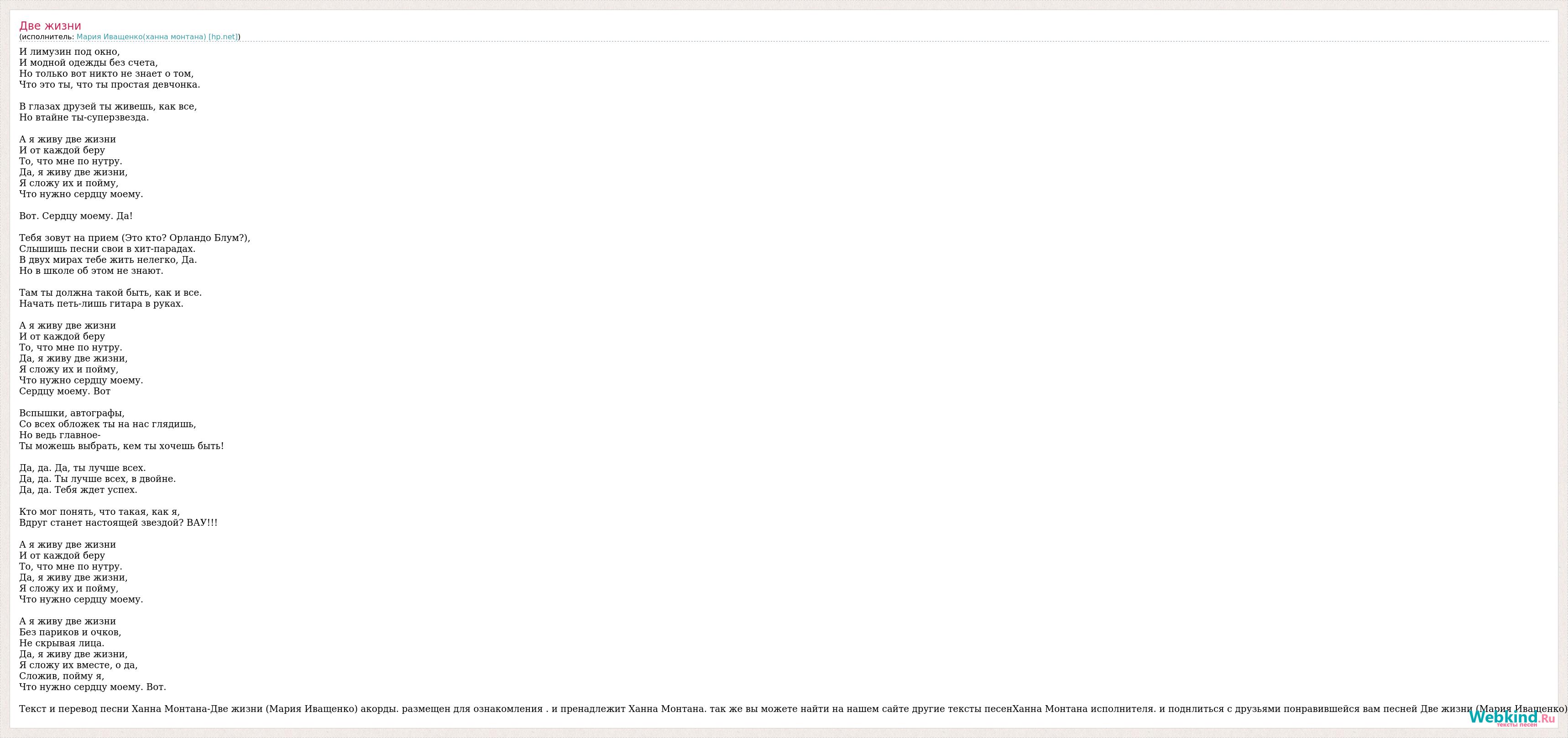 И лимузин под окно, И модной одежды без счета, Но только вот никто не знает о том, Что это ты, что ты простая девчонка. В глазах друзей ты живешь, как все, Но втайне ты-суперзвезда. А я живу две жизни И от каждой беру То, что мне по нутру. Да, я живу две жизни, Я сложу их и пойму, Что нужно сердцу моему. Вот. Сердцу моему. Да! Тебя зовут на прием (Это кто? Орландо Блум?), Слышишь песни свои в хит-парадах. В двух мирах тебе жить нелегко, Да. Но в школе об этом не знают. Там ты должна такой быть, как и все. Начать петь-лишь гитара в руках. А я живу две жизни И от каждой беру То, что мне по нутру. Да, я живу две жизни, Я сложу их и пойму, Что нужно сердцу моему. Сердцу моему. Вот Вспышки, автографы, Со всех обложек ты на нас глядишь, Но ведь главное- Ты можешь выбрать, кем ты хочешь быть! Да, да. Да, ты лучше всех. Да, да. Ты лучше всех, в двойне. Да, да. Тебя ждет успех. Кто мог понять, что такая, как я, Вдруг станет настоящей звездой? ВАУ!!! А я живу две жизни И от каждой беру То, что мне по нутру. Да, я живу две жизни, Я сложу их и пойму, Что нужно сердцу моему. А я живу две жизни Без париков и очков, Не скрывая лица. Да, я живу две жизни, Я сложу их вместе, о да, Сложив, пойму я, Что нужно сердцу моему. Вот. Текст и перевод песни Ханна Монтана-Две жизни (Мария Иващенко) акорды. размещен для ознакомления . и пренадлежит Ханна Монтана. так же вы можете найти на нашем сайте другие тексты песенХанна Монтана исполнителя. и поднлиться с друзьями понравившейся вам песней Две жизни (Мария Иващенко)