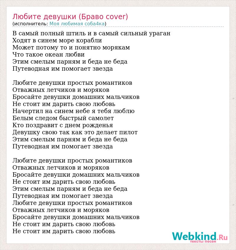 В самый полный штиль и в самый сильный ураган Ходят в синем море корабли Может потому то и понятно морякам Что такое океан любви Этим смелым парням и беда не беда Путеводная им помогает звезда Любите девушки простых романтиков Отважных летчиков и моряков Бросайте девушки домашних мальчиков Не стоит им дарить свою любовь Начертил на синем небе я тебя люблю Белым следом быстрый самолет Кто поздравит с днем рожденья Девушку свою так как это делает пилот Этим смелым парням и беда не беда Путеводная им помогает звезда Любите девушки простых романтиков Отважных летчиков и моряков Бросайте девушки домашних мальчиков Не стоит им дарить свою любовь Этим смелым парням и беда не беда Путеводная им помогает звезда Любите девушки простых романтиков Отважных летчиков и моряков Бросайте девушки домашних мальчиков Не стоит им дарить свою любовь Не стоит им дарить свою любовь
