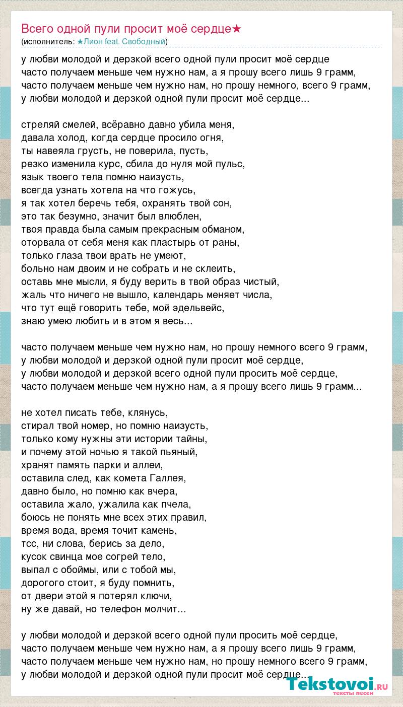 у любви молодой и дерзкой всего одной пули просит моё сердце часто получаем меньше чем нужно нам, а я прошу всего лишь 9 грамм, часто получаем меньше чем нужно нам, но прошу немного, всего 9 грамм, у любви молодой и дерзкой одной пули просит моё сердце... стреляй смелей, всёравно давно убила меня, давала холод, когда сердце просило огня, ты навеяла грусть, не поверила, пусть, резко изменила курс, сбила до нуля мой пульс, язык твоего тела помню наизусть, всегда узнать хотела на что гожусь, я так хотел беречь тебя, охранять твой сон, это так безумно, значит был влюблен, твоя правда была самым прекрасным обманом, оторвала от себя меня как пластырь от раны, только глаза твои врать не умеют, больно нам двоим и не собрать и не склеить, оставь мне мысли, я буду верить в твой образ чистый, жаль что ничего не вышло, календарь меняет числа, что тут ещё говорить тебе, мой эдельвейс, знаю умею любить и в этом я весь... часто получаем меньше чем нужно нам, но прошу немного всего 9 грамм, у любви молодой и дерзкой одной пули просит моё сердце, у любви молодой и дерзкой всего одной пули просить моё сердце, часто получаем меньше чем нужно нам, а я прошу всего лишь 9 грамм... не хотел писать тебе, клянусь, стирал твой номер, но помню наизусть, только кому нужны эти истории тайны, и почему этой ночью я такой пьяный, хранят память парки и аллеи, оставила след, как комета Галлея, давно было, но помню как вчера, оставила жало, ужалила как пчела, боюсь не понять мне всех этих правил, время вода, время точит камень, тсс, ни слова, берись за дело, кусок свинца мое согрей тело, выпал с обоймы, или с тобой мы, дорогого стоит, я буду помнить, от двери этой я потерял ключи, ну же давай, но телефон молчит... у любви молодой и дерзкой всего одной пули просить моё сердце, часто получаем меньше чем нужно нам, а я прошу всего лишь 9 грамм, часто получаем меньше чем нужно нам, но прошу немного всего 9 грамм, у любви молодой и дерзкой одной пули просит моё сердце...