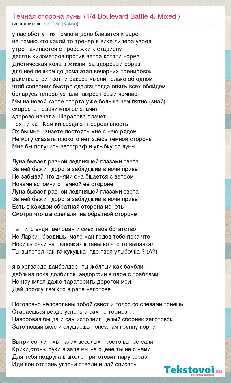 у нас обет у них темно и дело близится к заре не помню кто какой то тренер в вике лидера узрел утро начинается с пробежки к стадиону десять километров против ветра кстати норма Диетическая кола в жизни за здоровый образ для неё пешком до дома этап вечерних тренировок ракетка стоит сотни баксов мысли только об одном чтоб соперник быстро сдался тогда опять всех обойдём беларусь теперь узнали- вырос новый чемпион Мы на новой карте спорта уже больше чем пятно (знай) скорость подачи многое значит здорово начала -Шарапова плачет Тех ни ка , Кри ки создают неореальность Эх бы мне , знаете постоять мне с нею рядом Не могу сказать плохого нет здесь тёмной стороны Мне бы получить автограф и улыбку от луны Луна бывает разной ледянящей глазами света За ней бежит дорога заблудшим в ночи привет Не забывай что днями она бщается с ветром Ночами вспомни о тёмной её стороне Луна бывает разной ледянящей глазами света За ней бежит дорога заблудшим в ночи привет Есть в каждом обратная сторона монеты Смотри что мы сделали на обратной стороне Ты типо энди, меломан и смех твоё богатство Не Ларкин бредишь, мало ман годов тебе пока что Носишь очки на цыпочках штаны во что то выпачкал Ты вылетел как та кукушка- где твоя улыбочка ? (А?) я в хогварде дамболдор ты жёлтый как бамбли даблкил пока долбился эндорфин в паре с траблами Не научился даже тараторить дорогой мой Дай дорогу тем кто в рэпе наготове Поголовно недовольны тобой свист и голос со слезами тонешь Стараешься везде успеть а сам то тормоз … Наворовал бы да и сам исполнил целый сборник заготовок Зато новый вкус и слушаешь попсу.там группу корни Вытри сопли - мы таких веселых просто вытре сали Крики,стоны руки в зале мы на сцене ты не с нами Для тебя подруга в школе приготовит пару фраз: Иди вон отстань угасни отвали и дай списать