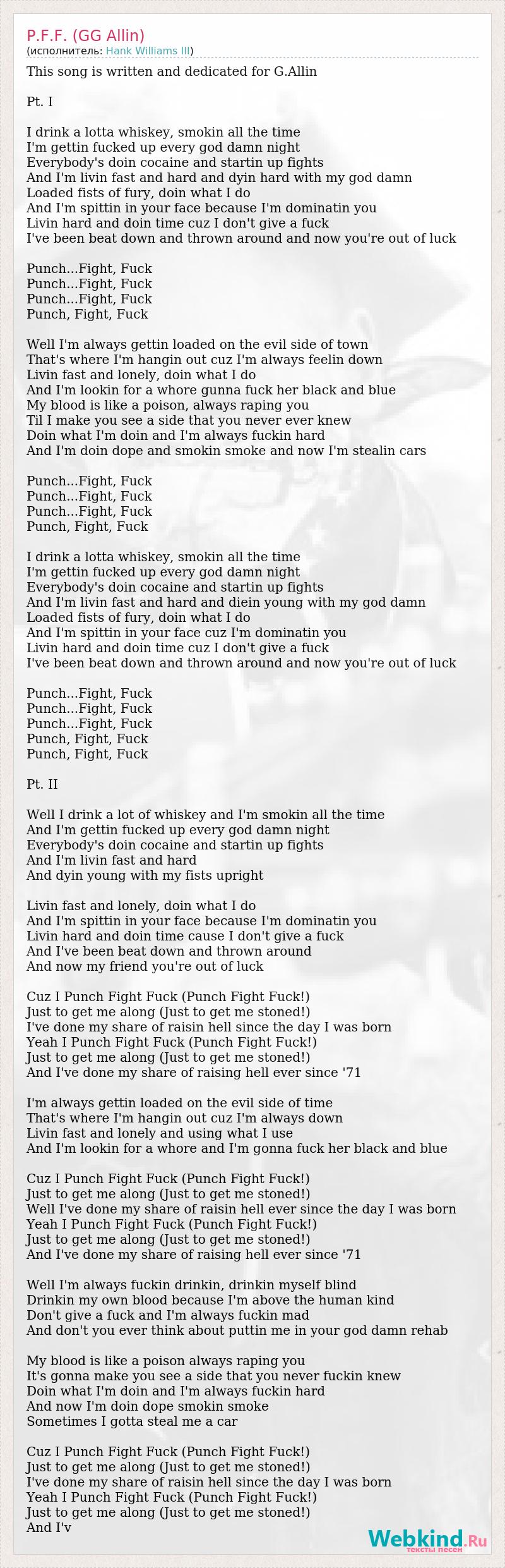This song is written and dedicated for G.Allin Pt. I I drink a lotta whiskey, smokin all the time I'm gettin fucked up every god damn night Everybody's doin cocaine and startin up fights And I'm livin fast and hard and dyin hard with my god damn Loaded fists of fury, doin what I do And I'm spittin in your face because I'm dominatin you Livin hard and doin time cuz I don't give a fuck I've been beat down and thrown around and now you're out of luck Punch...Fight, Fuck Punch...Fight, Fuck Punch...Fight, Fuck Punch, Fight, Fuck Well I'm always gettin loaded on the evil side of town That's where I'm hangin out cuz I'm always feelin down Livin fast and lonely, doin what I do And I'm lookin for a whore gunna fuck her black and blue My blood is like a poison, always raping you Til I make you see a side that you never ever knew Doin what I'm doin and I'm always fuckin hard And I'm doin dope and smokin smoke and now I'm stealin cars Punch...Fight, Fuck Punch...Fight, Fuck Punch...Fight, Fuck Punch, Fight, Fuck I drink a lotta whiskey, smokin all the time I'm gettin fucked up every god damn night Everybody's doin cocaine and startin up fights And I'm livin fast and hard and diein young with my god damn Loaded fists of fury, doin what I do And I'm spittin in your face cuz I'm dominatin you Livin hard and doin time cuz I don't give a fuck I've been beat down and thrown around and now you're out of luck Punch...Fight, Fuck Punch...Fight, Fuck Punch...Fight, Fuck Punch, Fight, Fuck Punch, Fight, Fuck Pt. II Well I drink a lot of whiskey and I'm smokin all the time And I'm gettin fucked up every god damn night Everybody's doin cocaine and startin up fights And I'm livin fast and hard And dyin young with my fists upright Livin fast and lonely, doin what I do And I'm spittin in your face because I'm dominatin you Livin hard and doin time cause I don't give a fuck And I've been beat down and thrown around And now my friend you're out of luck Cuz I Punch Fight Fuck (Punch Fight Fuck!) Just to get me along (Just to get me stoned!) I've done my share of raisin hell since the day I was born Yeah I Punch Fight Fuck (Punch Fight Fuck!) Just to get me along (Just to get me stoned!) And I've done my share of raising hell ever since '71 I'm always gettin loaded on the evil side of time That's where I'm hangin out cuz I'm always down Livin fast and lonely and using what I use And I'm lookin for a whore and I'm gonna fuck her black and blue Cuz I Punch Fight Fuck (Punch Fight Fuck!) Just to get me along (Just to get me stoned!) Well I've done my share of raisin hell ever since the day I was born Yeah I Punch Fight Fuck (Punch Fight Fuck!) Just to get me along (Just to get me stoned!) And I've done my share of raising hell ever since '71 Well I'm always fuckin drinkin, drinkin myself blind Drinkin my own blood because I'm above the human kind Don't give a fuck and I'm always fuckin mad And don't you ever think about puttin me in your god damn rehab My blood is like a poison always raping you It's gonna make you see a side that you never fuckin knew Doin what I'm doin and I'm always fuckin hard And now I'm doin dope smokin smoke Sometimes I gotta steal me a car Cuz I Punch Fight Fuck (Punch Fight Fuck!) Just to get me along (Just to get me stoned!) I've done my share of raisin hell since the day I was born Yeah I Punch Fight Fuck (Punch Fight Fuck!) Just to get me along (Just to get me stoned!) And I'v