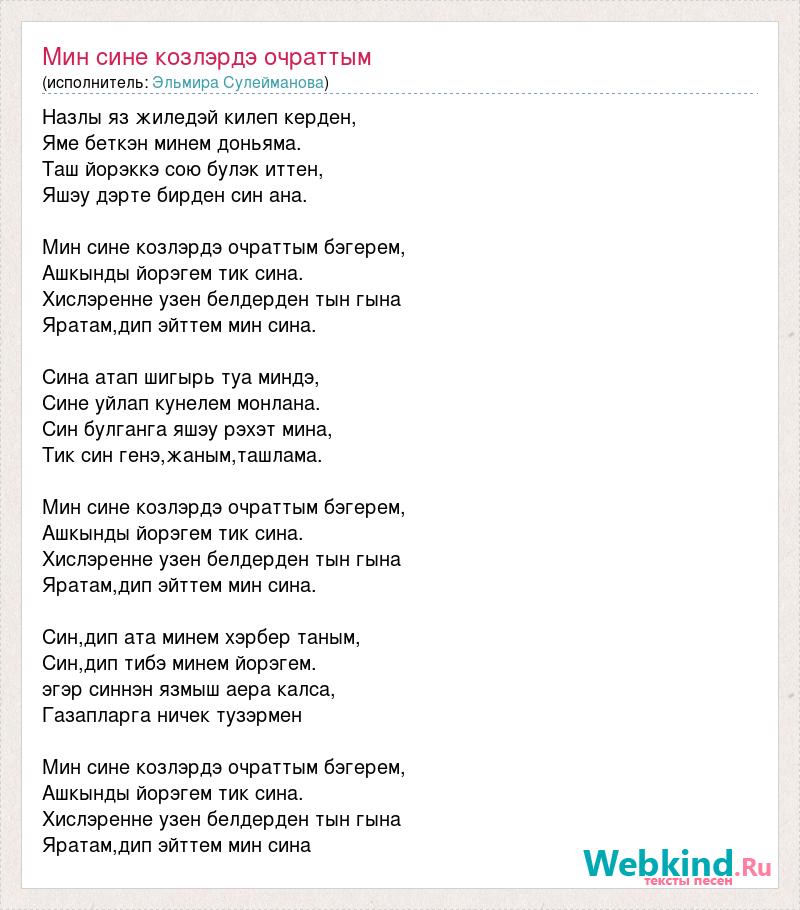 Назлы яз жиледэй килеп керден, Яме беткэн минем доньяма. Таш йорэккэ сою булэк иттен, Яшэу дэрте бирден син ана. Мин сине козлэрдэ очраттым бэгерем, Ашкынды йорэгем тик сина. Хислэренне узен белдерден тын гына Яратам,дип эйттем мин сина. Сина атап шигырь туа миндэ, Сине уйлап кунелем монлана. Син булганга яшэу рэхэт мина, Тик син генэ,жаным,ташлама. Мин сине козлэрдэ очраттым бэгерем, Ашкынды йорэгем тик сина. Хислэренне узен белдерден тын гына Яратам,дип эйттем мин сина. Син,дип ата минем хэрбер таным, Син,дип тибэ минем йорэгем. эгэр синнэн язмыш аера калса, Газапларга ничек тузэрмен Мин сине козлэрдэ очраттым бэгерем, Ашкынды йорэгем тик сина. Хислэренне узен белдерден тын гына Яратам,дип эйттем мин сина