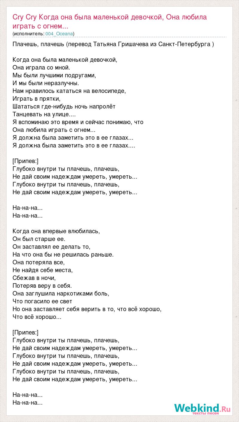 Плачешь, плачешь (перевод Татьяна Гришачева из Санкт-Петербурга ) Когда она была маленькой девочкой, Она играла со мной. Мы были лучшими подругами, И мы были неразлучны. Нам нравилось кататься на велосипеде, Играть в прятки, Шататься где-нибудь ночь напролёт Танцевать на улице.... Я вспоминаю это время и сейчас понимаю, что Она любила играть с огнем... Я должна была заметить это в ее глазах... Я должна была заметить это в ее глазах.... [Припев:] Глубоко внутри ты плачешь, плачешь, Не дай своим надеждам умереть, умереть... Глубоко внутри ты плачешь, плачешь, Не дай своим надеждам умереть, умереть... На-на-на... На-на-на... Когда она впервые влюбилась, Он был старше ее. Он заставлял ее делать то, На что она бы не решилась раньше. Она потеряла все, Не найдя себе места, Сбежав в ночи, Потеряв веру в себя. Она заглушила наркотиками боль, Что погасило ее свет Но она заставляет себя верить в то, что всё хорошо, Что всё хорошо... [Припев:] Глубоко внутри ты плачешь, плачешь, Не дай своим надеждам умереть, умереть... Глубоко внутри ты плачешь, плачешь, Не дай своим надеждам умереть, умереть... Глубоко внутри ты плачешь, плачешь, Не дай своим надеждам умереть, умереть... На-на-на... На-на-на...