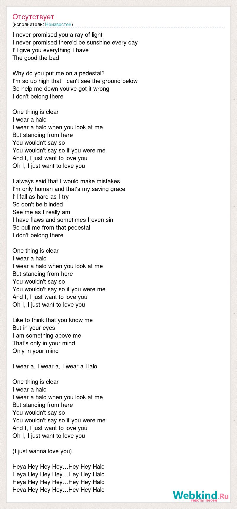 I never promised you a ray of light I never promised there'd be sunshine every day I'll give you everything I have The good the bad Why do you put me on a pedestal? I'm so up high that I can't see the ground below So help me down you've got it wrong I don't belong there One thing is clear I wear a halo I wear a halo when you look at me But standing from here You wouldn't say so You wouldn't say so if you were me And I, I just want to love you Oh I, I just want to love you I always said that I would make mistakes I'm only human and that's my saving grace I'll fall as hard as I try So don't be blinded See me as I really am I have flaws and sometimes I even sin So pull me from that pedestal I don't belong there One thing is clear I wear a halo I wear a halo when you look at me But standing from here You wouldn't say so You wouldn't say so if you were me And I, I just want to love you Oh I, I just want to love you Like to think that you know me But in your eyes I am something above me That's only in your mind Only in your mind I wear a, I wear a, I wear a Halo One thing is clear I wear a halo I wear a halo when you look at me But standing from here You wouldn't say so You wouldn't say so if you were me And I, I just want to love you Oh I, I just want to love you (I just wanna love you) Heya Hey Hey Hey…Hey Hey Halo Heya Hey Hey Hey…Hey Hey Halo Heya Hey Hey Hey…Hey Hey Halo Heya Hey Hey Hey…Hey Hey Halo
