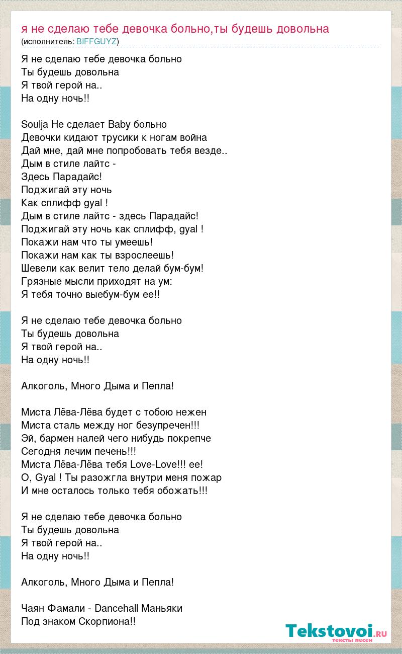 Я не сделаю тебе девочка больно Ты будешь довольна Я твой герой на.. На одну ночь!! Soulja Не сделает Baby больно Девочки кидают трусики к ногам война Дай мне, дай мне попробовать тебя везде.. Дым в стиле лайтс - Здесь Парадайс! Поджигай эту ночь Как сплифф gyal ! Дым в стиле лайтс - здесь Парадайс! Поджигай эту ночь как сплифф, gyal ! Покажи нам что ты умеешь! Покажи нам как ты взрослеешь! Шевели как велит тело делай бум-бум! Грязные мысли приходят на ум: Я тебя точно выебум-бум ее!! Я не сделаю тебе девочка больно Ты будешь довольна Я твой герой на.. На одну ночь!! Алкоголь, Много Дыма и Пепла! Миста Лёва-Лёва будет с тобою нежен Миста сталь между ног безупречен!!! Эй, бармен налей чего нибудь покрепче Сегодня лечим печень!!! Миста Лёва-Лёва тебя Love-Love!!! ее! O, Gyal ! Ты разожгла внутри меня пожар И мне осталось только тебя обожать!!! Я не сделаю тебе девочка больно Ты будешь довольна Я твой герой на.. На одну ночь!! Алкоголь, Много Дыма и Пепла! Чаян Фамали - Dancehall Маньяки Под знаком Скорпиона!!