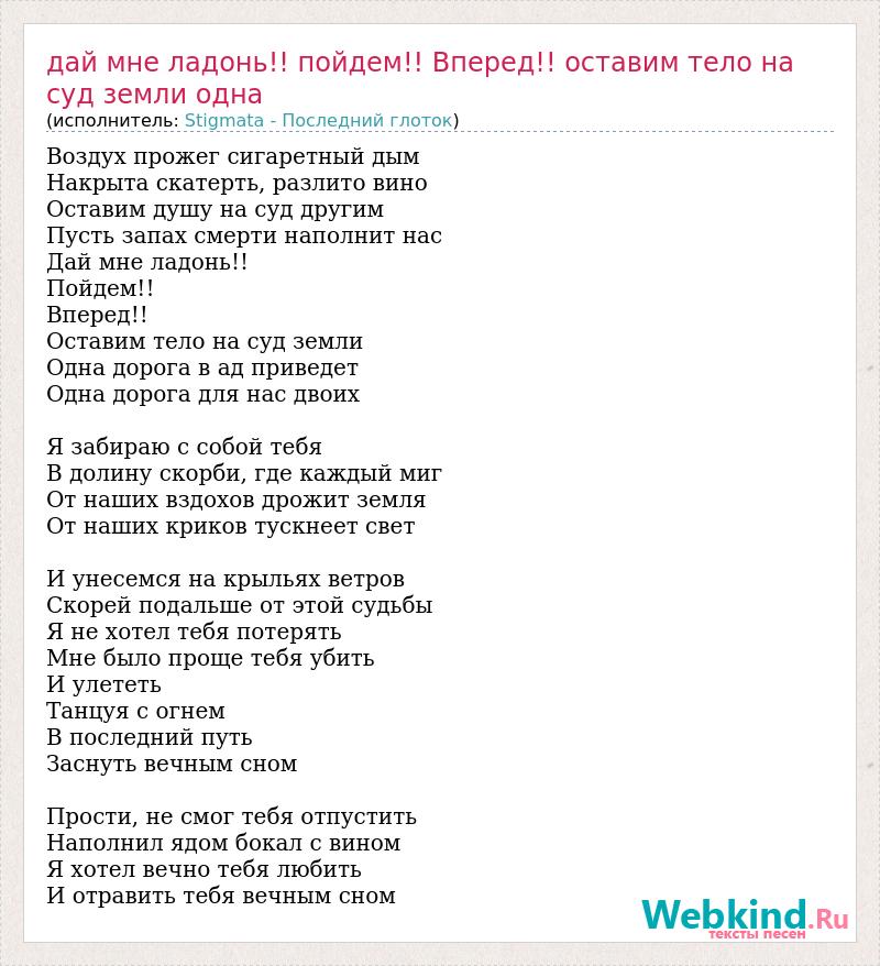 Главная→Исполнители→Stigmata - Последний глоток→Дай мне ладонь!! пойдем!! Вперед!! оставим тело на суд земли одна