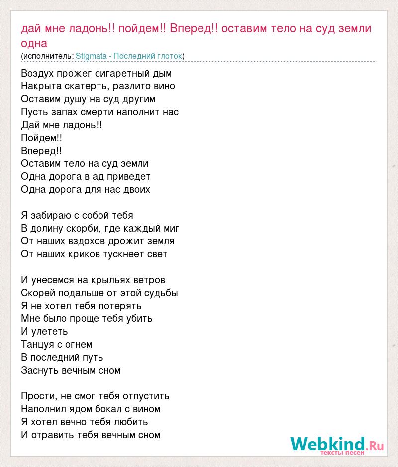 Главная→Исполнители→Stigmata - Последний глоток→Дай мне ладонь!! пойдем!! Вперед!! оставим тело на суд земли одна