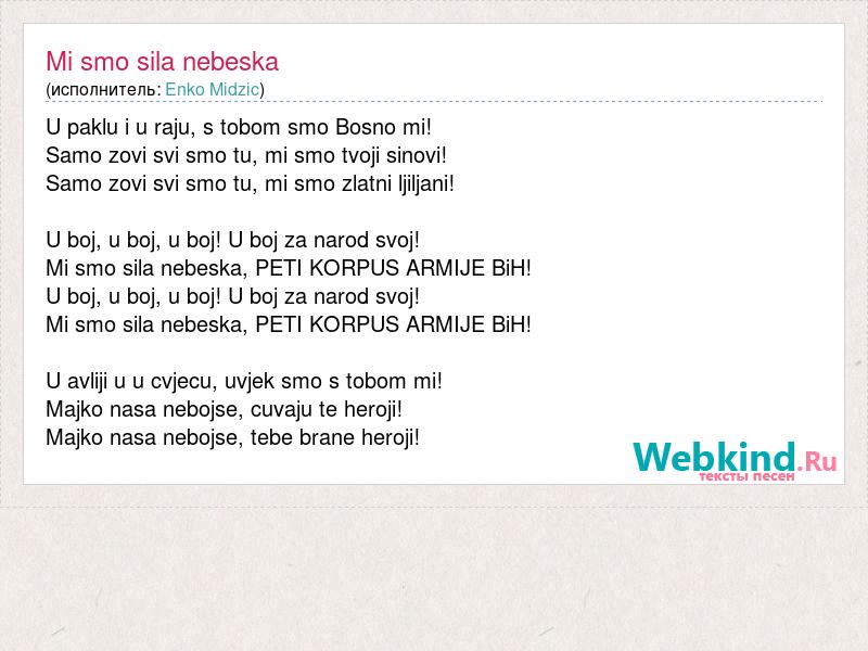 U paklu i u raju, s tobom smo Bosno mi! Samo zovi svi smo tu, mi smo tvoji sinovi! Samo zovi svi smo tu, mi smo zlatni ljiljani! U boj, u boj, u boj! U boj za narod svoj! Mi smo sila nebeska, PETI KORPUS ARMIJE BiH! U boj, u boj, u boj! U boj za narod svoj! Mi smo sila nebeska, PETI KORPUS ARMIJE BiH! U avliji u u cvjecu, uvjek smo s tobom mi! Majko nasa nebojse, cuvaju te heroji! Majko nasa nebojse, tebe brane heroji!