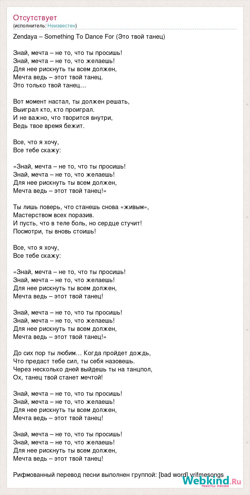 Zendaya – Something To Dance For (Это твой танец) Знай, мечта – не то, что ты просишь! Знай, мечта – не то, что желаешь! Для нее рискнуть ты всем должен, Мечта ведь – этот твой танец. Это только твой танец… Вот момент настал, ты должен решать, Выиграл кто, кто проиграл. И не важно, что творится внутри, Ведь твое время бежит. Все, что я хочу, Все тебе скажу: «Знай, мечта – не то, что ты просишь! Знай, мечта – не то, что желаешь! Для нее рискнуть ты всем должен, Мечта ведь – этот твой танец!» Ты лишь поверь, что станешь снова «живым», Мастерством всех поразив. И пусть, что в теле боль, но сердце стучит! Посмотри, ты вновь стоишь! Все, что я хочу, Все тебе скажу: «Знай, мечта – не то, что ты просишь! Знай, мечта – не то, что желаешь! Для нее рискнуть ты всем должен, Мечта ведь – этот твой танец! Знай, мечта – не то, что ты просишь! Знай, мечта – не то, что желаешь! Для нее рискнуть ты всем должен, Мечта ведь – этот твой танец!» До сих пор ты любим… Когда пройдет дождь, Что предаст тебе сил, ты себя назовешь. Через несколько дней выйдешь ты на танцпол, Ох, танец твой станет мечтой! Знай, мечта – не то, что ты просишь! Знай, мечта – не то, что желаешь! Для нее рискнуть ты всем должен, Мечта ведь – этот твой танец! Знай, мечта – не то, что ты просишь! Знай, мечта – не то, что желаешь! Для нее рискнуть ты всем должен, Мечта ведь – этот твой танец! Рифмованный перевод песни выполнен группой: [bad word] vrifmesongs