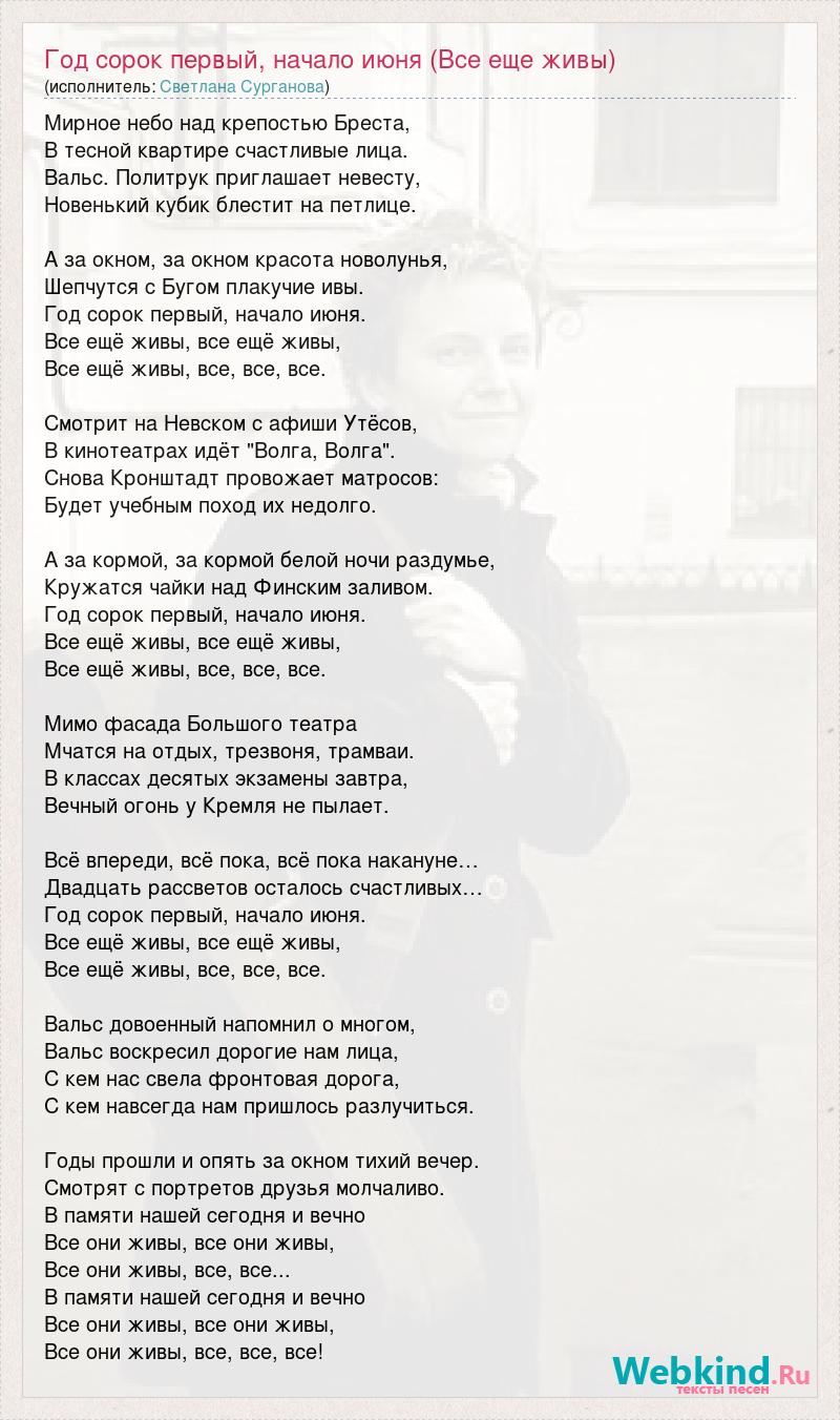Мирное небо над крепостью Бреста, В тесной квартире счастливые лица. Вальс. Политрук приглашает невесту, Новенький кубик блестит на петлице. А за окном, за окном красота новолунья, Шепчутся с Бугом плакучие ивы. Год сорок первый, начало июня. Все ещё живы, все ещё живы, Все ещё живы, все, все, все. Смотрит на Невском с афиши Утёсов, В кинотеатрах идёт "Волга, Волга". Снова Кронштадт провожает матросов: Будет учебным поход их недолго. А за кормой, за кормой белой ночи раздумье, Кружатся чайки над Финским заливом. Год сорок первый, начало июня. Все ещё живы, все ещё живы, Все ещё живы, все, все, все. Мимо фасада Большого театра Мчатся на отдых, трезвоня, трамваи. В классах десятых экзамены завтра, Вечный огонь у Кремля не пылает. Всё впереди, всё пока, всё пока накануне… Двадцать рассветов осталось счастливых… Год сорок первый, начало июня. Все ещё живы, все ещё живы, Все ещё живы, все, все, все. Вальс довоенный напомнил о многом, Вальс воскресил дорогие нам лица, С кем нас свела фронтовая дорога, С кем навсегда нам пришлось разлучиться. Годы прошли и опять за окном тихий вечер. Смотрят с портретов друзья молчаливо. В памяти нашей сегодня и вечно Все они живы, все они живы, Все они живы, все, все... В памяти нашей сегодня и вечно Все они живы, все они живы, Все они живы, все, все, все!