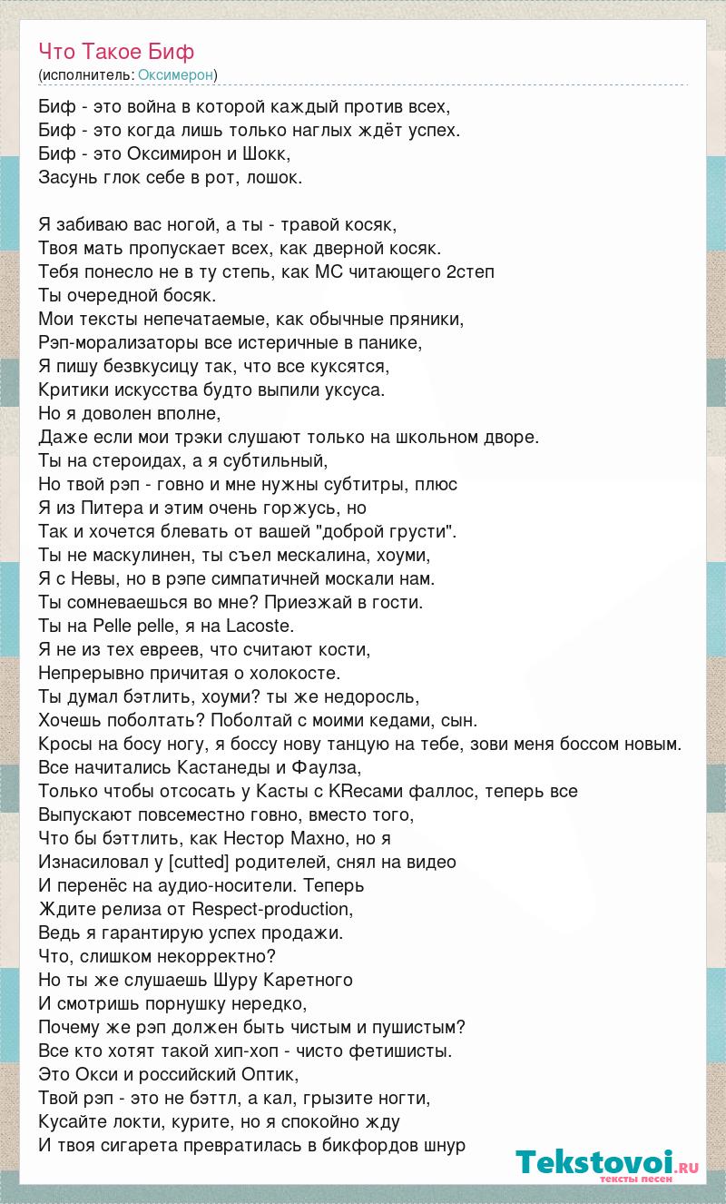 Биф - это война в которой каждый против всех, Биф - это когда лишь только наглых ждёт успех. Биф - это Оксимирон и Шокк, Засунь глок себе в рот, лошок. Я забиваю вас ногой, а ты - травой косяк, Твоя мать пропускает всех, как дверной косяк. Тебя понесло не в ту степь, как MC читающего 2степ Ты очередной босяк. Мои тексты непечатаемые, как обычные пряники, Рэп-морализаторы все истеричные в панике, Я пишу безвкусицу так, что все куксятся, Критики искусства будто выпили уксуса. Но я доволен вполне, Даже если мои трэки слушают только на школьном дворе. Ты на стероидах, а я субтильный, Но твой рэп - говно и мне нужны субтитры, плюс Я из Питера и этим очень горжусь, но Так и хочется блевать от вашей "доброй грусти". Ты не маскулинен, ты съел мескалина, хоуми, Я с Невы, но в рэпе симпатичней москали нам. Ты сомневаешься во мне? Приезжай в гости. Ты на Pelle pelle, я на Lacoste. Я не из тех евреев, что считают кости, Непрерывно причитая о холокосте. Ты думал бэтлить, хоуми? ты же недоросль, Хочешь поболтать? Поболтай с моими кедами, сын. Кросы на босу ногу, я боссу нову танцую на тебе, зови меня боссом новым. Все начитались Кастанеды и Фаулза, Только чтобы отсосать у Касты с KRecами фаллос, теперь все Выпускают повсеместно говно, вместо того, Что бы бэттлить, как Нестор Махно, но я Изнасиловал у [cutted] родителей, снял на видео И перенёс на аудио-носители. Теперь Ждите релиза от Respect-production, Ведь я гарантирую успех продажи. Что, слишком некорректно? Но ты же слушаешь Шуру Каретного И смотришь порнушку нередко, Почему же рэп должен быть чистым и пушистым? Все кто хотят такой хип-хоп - чисто фетишисты. Это Окси и российский Оптик, Твой рэп - это не бэттл, а кал, грызите ногти, Кусайте локти, курите, но я спокойно жду И твоя сигарета превратилась в бикфордов шнур