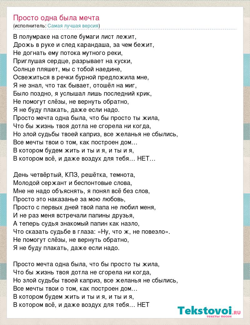 В полумраке на столе бумаги лист лежит, Дрожь в руке и след карандаша, за чем бежит, Не догнать ему потока мутного реки, Приглушая сердце, разрывает на куски, Солнце пляшет, мы с тобой наедине, Освежиться в речки бурной предложила мне, Я не знал, что так бывает, отошёл на миг, Было поздно, я услышал лишь последний крик, Не помогут слёзы, не вернуть обратно, Я не буду плакать, даже если надо. Просто мечта одна была, что бы просто ты жила, Что бы жизнь твоя дотла не сгорела ни когда, Но злой судьбы твоей каприз, все желанья не сбылись, Все мечты твои о том, как построен дом… В котором будем жить и ты и я, и ты и я, В котором всё, и даже воздух для тебя… НЕТ… День четвёртый, КПЗ, решётка, темнота, Молодой сержант и беспонтовые слова, Мне не надо объяснять, я понял всё без слов, Просто это наказанье за мою любовь, Просто с первых дней твой папа не любил меня, И не раз меня встречали папины друзья, А теперь судья знакомый папин как назло, Что сказать судьбе в глаза: «Ну, что ж, не повезло». Не помогут слёзы, не вернуть обратно, Я не буду плакать, даже если надо. Просто мечта одна была, что бы просто ты жила, Что бы жизнь твоя дотла не сгорела ни когда, Но злой судьбы твоей каприз, все желанья не сбылись, Все мечты твои о том, как построен дом… В котором будем жить и ты и я, и ты и я, В котором всё, и даже воздух для тебя… НЕТ