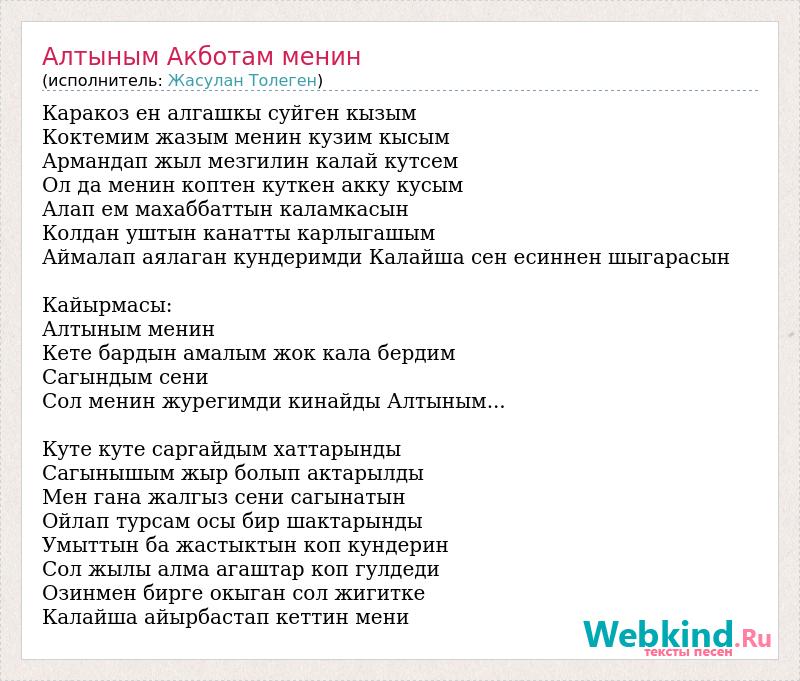 Каракоз ен алгашкы суйген кызым Коктемим жазым менин кузим кысым Армандап жыл мезгилин калай кутсем Ол да менин коптен куткен акку кусым Алап ем махаббаттын каламкасын Колдан уштын канатты карлыгашым Аймалап аялаган кундеримди Калайша сен есиннен шыгарасын Кайырмасы: Алтыным менин Кете бардын амалым жок кала бердим Сагындым сени Сол менин журегимди кинайды Алтыным... Куте куте саргайдым хаттарынды Сагынышым жыр болып актарылды Мен гана жалгыз сени сагынатын Ойлап турсам осы бир шактарынды Умыттын ба жастыктын коп кундерин Сол жылы алма агаштар коп гулдеди Озинмен бирге окыган сол жигитке Калайша айырбастап кеттин мени