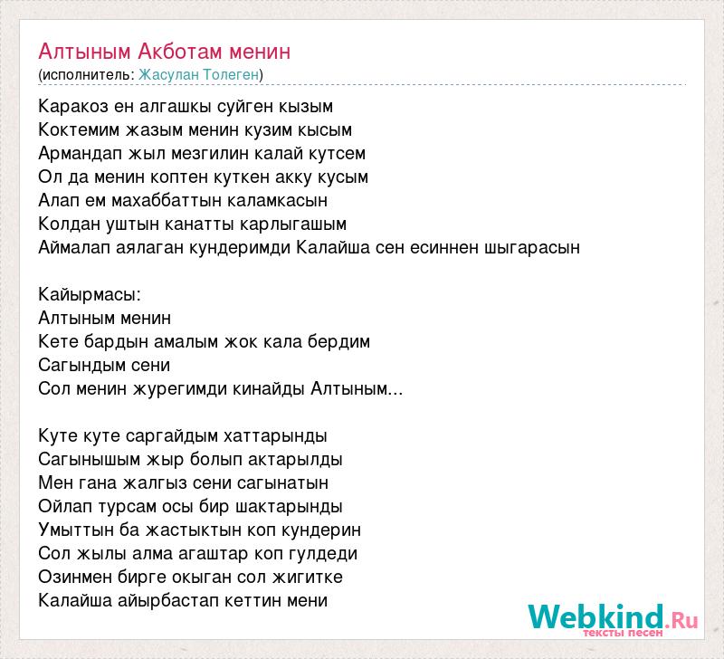 Каракоз ен алгашкы суйген кызым Коктемим жазым менин кузим кысым Армандап жыл мезгилин калай кутсем Ол да менин коптен куткен акку кусым Алап ем махаббаттын каламкасын Колдан уштын канатты карлыгашым Аймалап аялаган кундеримди Калайша сен есиннен шыгарасын Кайырмасы: Алтыным менин Кете бардын амалым жок кала бердим Сагындым сени Сол менин журегимди кинайды Алтыным... Куте куте саргайдым хаттарынды Сагынышым жыр болып актарылды Мен гана жалгыз сени сагынатын Ойлап турсам осы бир шактарынды Умыттын ба жастыктын коп кундерин Сол жылы алма агаштар коп гулдеди Озинмен бирге окыган сол жигитке Калайша айырбастап кеттин мени