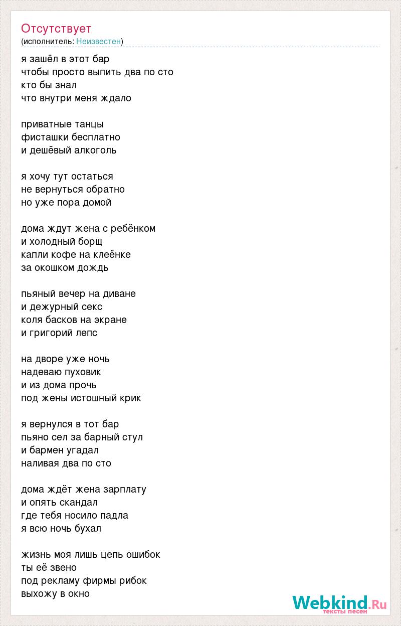 я зашёл в этот бар чтобы просто выпить два по сто кто бы знал что внутри меня ждало приватные танцы фисташки бесплатно и дешёвый алкоголь я хочу тут остаться не вернуться обратно но уже пора домой дома ждут жена с ребёнком и холодный борщ капли кофе на клеёнке за окошком дождь пьяный вечер на диване и дежурный секс коля басков на экране и григорий лепс на дворе уже ночь надеваю пуховик и из дома прочь под жены истошный крик я вернулся в тот бар пьяно сел за барный стул и бармен угадал наливая два по сто дома ждёт жена зарплату и опять скандал где тебя носило падла я всю ночь бухал жизнь моя лишь цепь ошибок ты её звено под рекламу фирмы рибок выхожу в окно