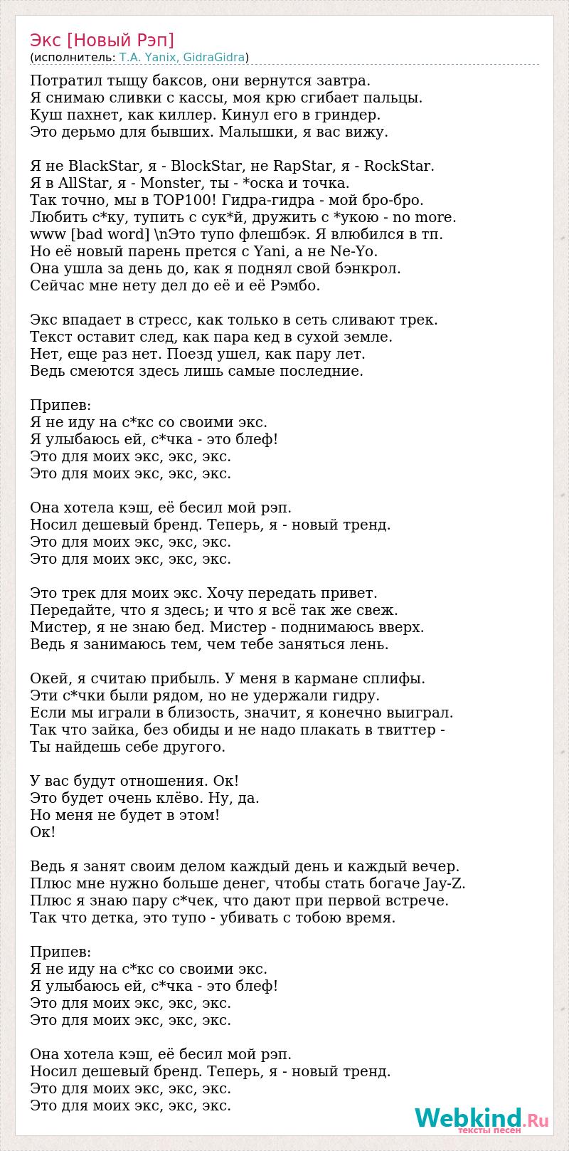 Потратил тыщу баксов, они вернутся завтра. Я снимаю сливки с кассы, моя крю сгибает пальцы. Куш пахнет, как киллер. Кинул его в гриндер. Это дерьмо для бывших. Малышки, я вас вижу. Я не BlackStar, я - BlockStar, не RapStar, я - RockStar. Я в AllStar, я - Monster, ты - *оска и точка. Так точно, мы в TOP100! Гидра-гидра - мой бро-бро. Любить с*ку, тупить с сук*й, дружить с *укою - no more. www [bad word] \nЭто тупо флешбэк. Я влюбился в тп. Но её новый парень прется с Yani, а не Ne-Yo. Она ушла за день до, как я поднял свой бэнкрол. Сейчас мне нету дел до её и её Рэмбо. Экс впадает в стресс, как только в сеть сливают трек. Текст оставит след, как пара кед в сухой земле. Нет, еще раз нет. Поезд ушел, как пару лет. Ведь смеются здесь лишь самые последние. Припев: Я не иду на с*кс со своими экс. Я улыбаюсь ей, с*чка - это блеф! Это для моих экс, экс, экс. Это для моих экс, экс, экс. Она хотела кэш, её бесил мой рэп. Носил дешевый бренд. Теперь, я - новый тренд. Это для моих экс, экс, экс. Это для моих экс, экс, экс. Это трек для моих экс. Хочу передать привет. Передайте, что я здесь; и что я всё так же свеж. Мистер, я не знаю бед. Мистер - поднимаюсь вверх. Ведь я занимаюсь тем, чем тебе заняться лень. Окей, я считаю прибыль. У меня в кармане сплифы. Эти с*чки были рядом, но не удержали гидру. Если мы играли в близость, значит, я конечно выиграл. Так что зайка, без обиды и не надо плакать в твиттер - Ты найдешь себе другого. У вас будут отношения. Ок! Это будет очень клёво. Ну, да. Но меня не будет в этом! Ок! Ведь я занят своим делом каждый день и каждый вечер. Плюс мне нужно больше денег, чтобы стать богаче Jay-Z. Плюс я знаю пару с*чек, что дают при первой встрече. Так что детка, это тупо - убивать с тобою время. Припев: Я не иду на с*кс со своими экс. Я улыбаюсь ей, с*чка - это блеф! Это для моих экс, экс, экс. Это для моих экс, экс, экс. Она хотела кэш, её бесил мой рэп. Носил дешевый бренд. Теперь, я - новый тренд. Это для моих экс, экс, экс. Это для моих экс, экс, экс.