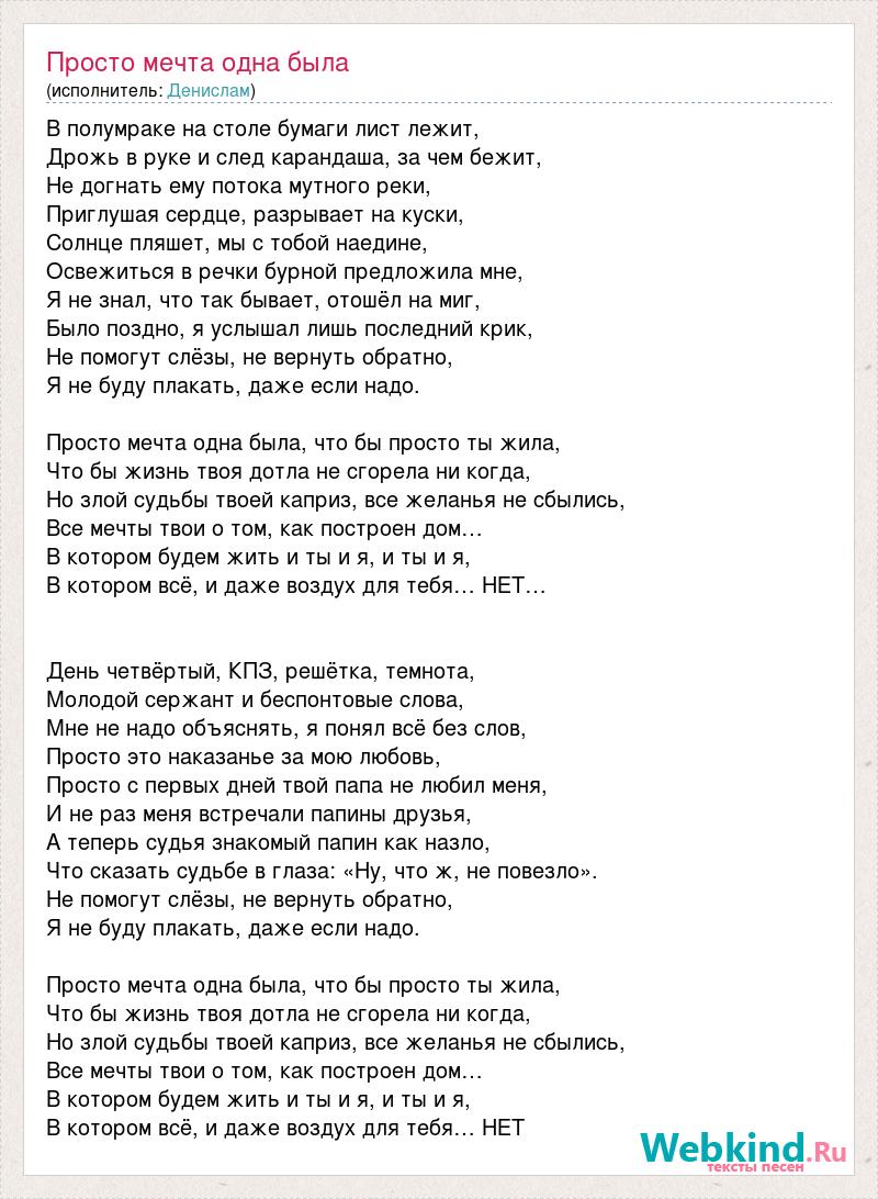 В полумраке на столе бумаги лист лежит, Дрожь в руке и след карандаша, за чем бежит, Не догнать ему потока мутного реки, Приглушая сердце, разрывает на куски, Солнце пляшет, мы с тобой наедине, Освежиться в речки бурной предложила мне, Я не знал, что так бывает, отошёл на миг, Было поздно, я услышал лишь последний крик, Не помогут слёзы, не вернуть обратно, Я не буду плакать, даже если надо. Просто мечта одна была, что бы просто ты жила, Что бы жизнь твоя дотла не сгорела ни когда, Но злой судьбы твоей каприз, все желанья не сбылись, Все мечты твои о том, как построен дом… В котором будем жить и ты и я, и ты и я, В котором всё, и даже воздух для тебя… НЕТ… День четвёртый, КПЗ, решётка, темнота, Молодой сержант и беспонтовые слова, Мне не надо объяснять, я понял всё без слов, Просто это наказанье за мою любовь, Просто с первых дней твой папа не любил меня, И не раз меня встречали папины друзья, А теперь судья знакомый папин как назло, Что сказать судьбе в глаза: «Ну, что ж, не повезло». Не помогут слёзы, не вернуть обратно, Я не буду плакать, даже если надо. Просто мечта одна была, что бы просто ты жила, Что бы жизнь твоя дотла не сгорела ни когда, Но злой судьбы твоей каприз, все желанья не сбылись, Все мечты твои о том, как построен дом… В котором будем жить и ты и я, и ты и я, В котором всё, и даже воздух для тебя… НЕТ