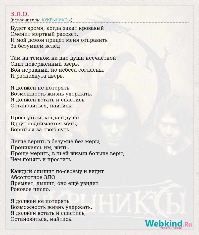 Будет время, когда закат кровавый Сменит мёртвый рассвет. И мой демон придёт меня отправить За безумием вслед Там на тёмном на дне души несчастной Спит поверженный зверь. Бой неравный, но небеса согласны, И распахнута дверь. Я должен не потерять Возможность жизнь удержать. Я должен встать и спастись, Остановиться, найтись. Проснуться, когда в душе Вдруг поднимается муть, Бороться за свою суть. Легче верить в безумие без меры, Проникаясь им, жить. Проще мерить, в чьей жизни больше веры, Чем понять и простить. Каждый слышит по-своему и видит Абсолютное ЗЛО Дремлет, дышит, оно ещё увидит Роковое число. Я должен не потерять Возможность жизнь удержать. Я должен встать и спастись, Остановиться, найтись.