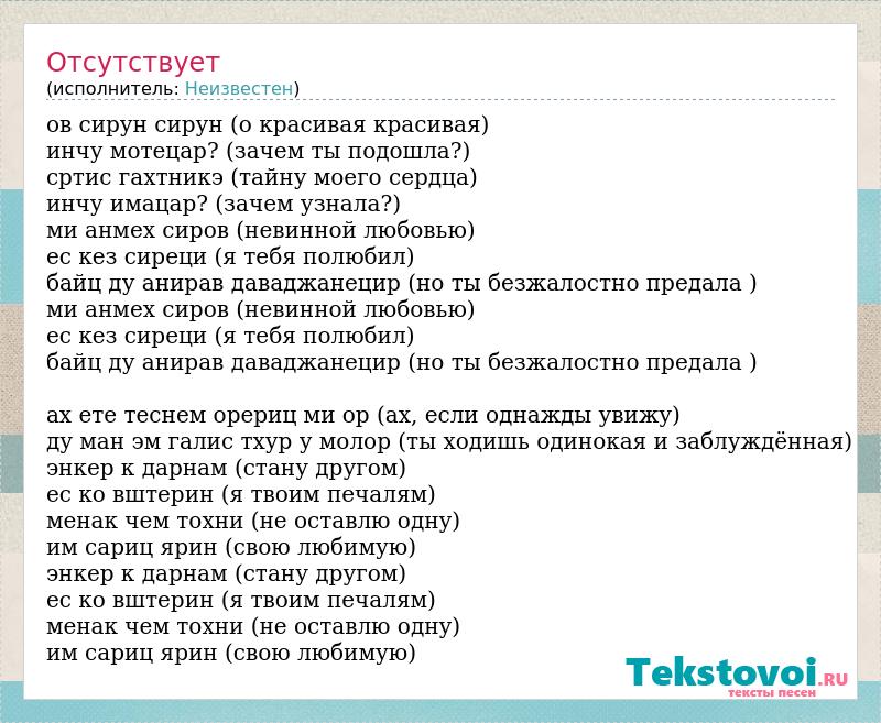 ов сирун сирун (о красивая красивая) инчу мотецар? (зачем ты подошла?) сртис гахтникэ (тайну моего сердца) инчу имацар? (зачем узнала?) ми анмех сиров (невинной любовью) ес кез сиреци (я тебя полюбил) байц ду анирав даваджанецир (но ты безжалостно предала ) ми анмех сиров (невинной любовью) ес кез сиреци (я тебя полюбил) байц ду анирав даваджанецир (но ты безжалостно предала ) ах ете теснем орериц ми ор (ах, если однажды увижу) ду ман эм галис тхур у молор (ты ходишь одинокая и заблуждённая) энкер к дарнам (стану другом) ес ко вштерин (я твоим печалям) менак чем тохни (не оставлю одну) им сариц ярин (свою любимую) энкер к дарнам (стану другом) ес ко вштерин (я твоим печалям) менак чем тохни (не оставлю одну) им сариц ярин (свою любимую)