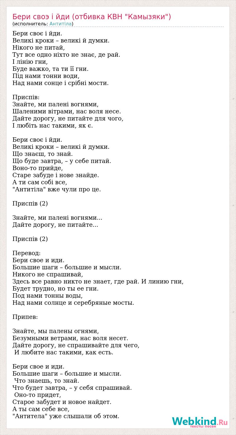 Бери своє і йди. Великі кроки – великі й думки. Нікого не питай, Тут все одно ніхто не знає, де рай. І лінію гни, Буде важко, та ти її гни. Під нами тонни води, Над нами сонце і срібні мости. Приспів: Знайте, ми палені вогнями, Шаленими вітрами, нас воля несе. Дайте дорогу, не питайте для чого, І любіть нас такими, як є. Бери своє і йди. Великі кроки – великі й думки. Що знаєш, то знай. Що буде завтра, – у себе питай. Воно-то прийде, Старе забуде і нове знайде. А ти сам собі все, "Антитіла" вже чули про це. Приспів (2) Знайте, ми палені вогнями... Дайте дорогу, не питайте... Приспів (2) Перевод: Бери свое и иди. Большие шаги – большие и мысли. Никого не спрашивай, Здесь все равно никто не знает, где рай. И линию гни, Будет трудно, но ты ее гни. Под нами тонны воды, Над нами солнце и серебряные мосты. Припев: Знайте, мы палены огнями, Безумными ветрами, нас воля несет. Дайте дорогу, не спрашивайте для чего, И любите нас такими, как есть. Бери свое и иди. Большие шаги – большие и мысли. Что знаешь, то знай. Что будет завтра, – у себя спрашивай. Оно-то придет, Старое забудет и новое найдет. А ты сам себе все, "Антитела" уже слышали об этом.