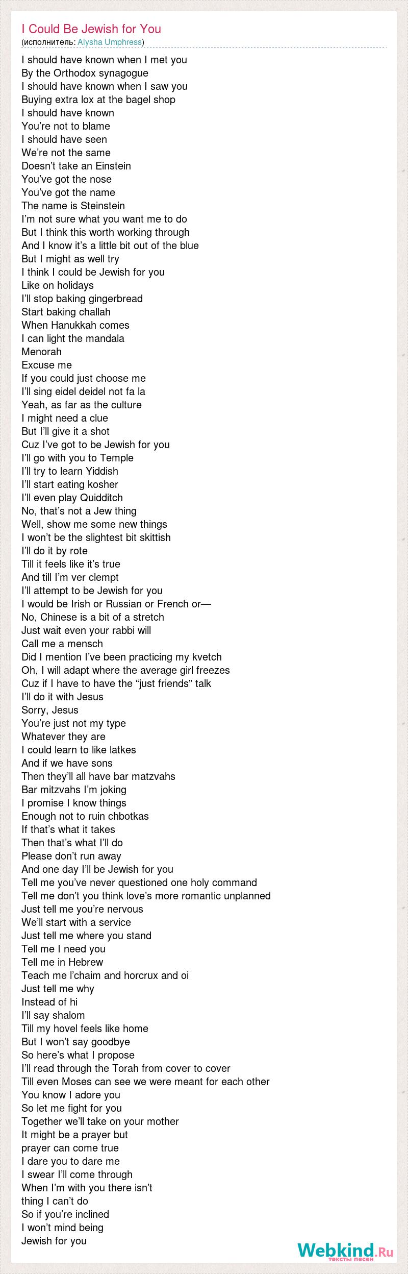 I should have known when I met you By the Orthodox synagogue I should have known when I saw you Buying extra lox at the bagel shop I should have known You’re not to blame I should have seen We’re not the same Doesn’t take an Einstein You’ve got the nose You’ve got the name The name is Steinstein I’m not sure what you want me to do But I think this worth working through And I know it’s a little bit out of the blue But I might as well try I think I could be Jewish for you Like on holidays I’ll stop baking gingerbread Start baking challah When Hanukkah comes I can light the mandala Menorah Excuse me If you could just choose me I’ll sing eidel deidel not fa la Yeah, as far as the culture I might need a clue But I’ll give it a shot Cuz I’ve got to be Jewish for you I’ll go with you to Temple I’ll try to learn Yiddish I’ll start eating kosher I’ll even play Quidditch No, that’s not a Jew thing Well, show me some new things I won’t be the slightest bit skittish I’ll do it by rote Till it feels like it’s true And till I’m ver clempt I’ll attempt to be Jewish for you I would be Irish or Russian or French or— No, Chinese is a bit of a stretch Just wait even your rabbi will Call me a mensch Did I mention I’ve been practicing my kvetch Oh, I will adapt where the average girl freezes Cuz if I have to have the “just friends” talk I’ll do it with Jesus Sorry, Jesus You’re just not my type Whatever they are I could learn to like latkes And if we have sons Then they’ll all have bar matzvahs Bar mitzvahs I’m joking I promise I know things Enough not to ruin chbotkas If that’s what it takes Then that’s what I’ll do Please don’t run away And one day I’ll be Jewish for you Tell me you’ve never questioned one holy command Tell me don’t you think love’s more romantic unplanned Just tell me you’re nervous We’ll start with a service Just tell me where you stand Tell me I need you Tell me in Hebrew Teach me l’chaim and horcrux and oi Just tell me why Instead of hi I’ll say shalom Till my hovel feels like home But I won’t say goodbye So here’s what I propose I’ll read through the Torah from cover to cover Till even Moses can see we were meant for each other You know I adore you So let me fight for you Together we’ll take on your mother It might be a prayer but prayer can come true I dare you to dare me I swear I’ll come through When I’m with you there isn’t thing I can’t do So if you’re inclined I won’t mind being Jewish for you