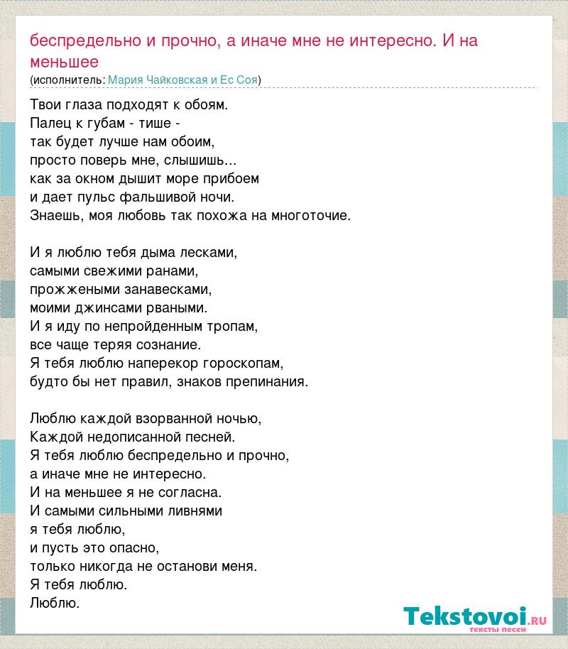 Главная→Исполнители→Мария Чайковская и Ес Соя→Беспредельно и прочно, а иначе мне не интересно. И на меньшее я не согласна. И