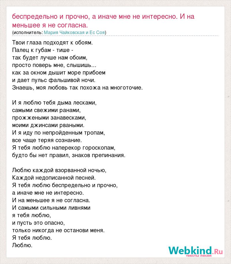 Твои глаза подходят к обоям. Палец к губам - тише - так будет лучше нам обоим, просто поверь мне, слышишь... как за окном дышит море прибоем и дает пульс фальшивой ночи. Знаешь, моя любовь так похожа на многоточие. И я люблю тебя дыма лесками, самыми свежими ранами, прожжеными занавесками, моими джинсами рваными. И я иду по непройденным тропам, все чаще теряя сознание. Я тебя люблю наперекор гороскопам, будто бы нет правил, знаков препинания. Люблю каждой взорванной ночью, Каждой недописанной песней. Я тебя люблю беспредельно и прочно, а иначе мне не интересно. И на меньшее я не согласна. И самыми сильными ливнями я тебя люблю, и пусть это опасно, только никогда не останови меня. Я тебя люблю. Люблю.