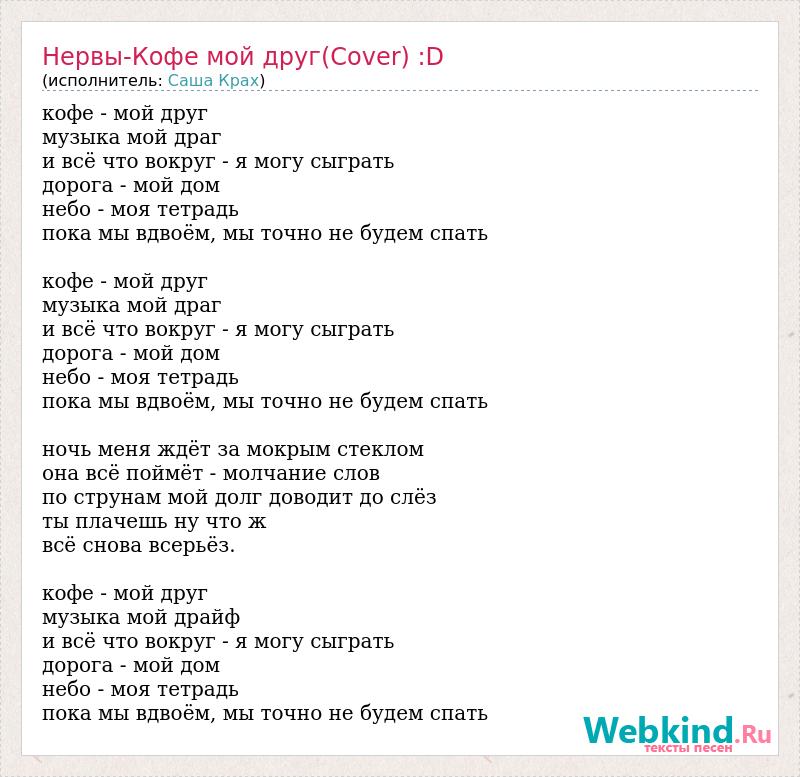 кофе - мой друг музыка мой драг и всё что вокруг - я могу сыграть дорога - мой дом небо - моя тетрадь пока мы вдвоём, мы точно не будем спать кофе - мой друг музыка мой драг и всё что вокруг - я могу сыграть дорога - мой дом небо - моя тетрадь пока мы вдвоём, мы точно не будем спать ночь меня ждёт за мокрым стеклом она всё поймёт - молчание слов по струнам мой долг доводит до слёз ты плачешь ну что ж всё снова всерьёз. кофе - мой друг музыка мой драйф и всё что вокруг - я могу сыграть дорога - мой дом небо - моя тетрадь пока мы вдвоём, мы точно не будем спать