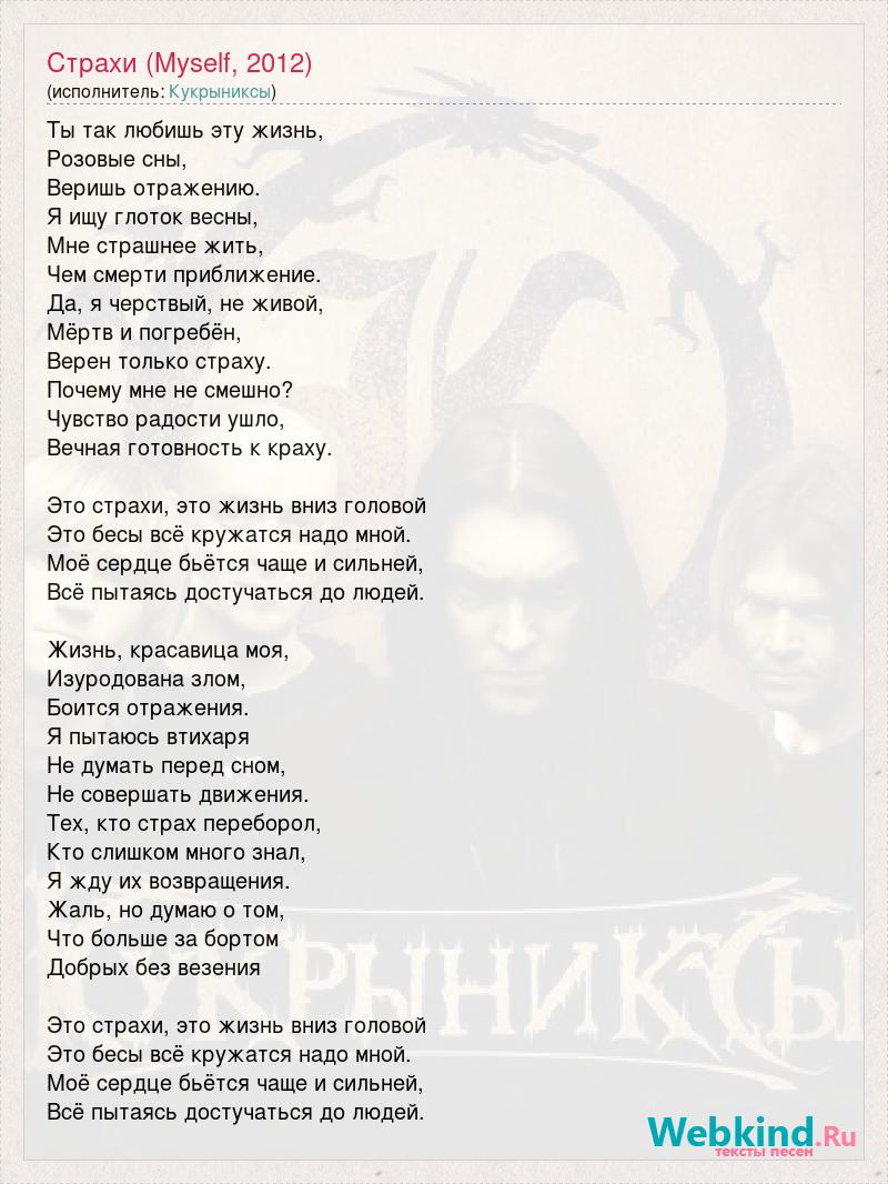 Ты так любишь эту жизнь, Розовые сны, Веришь отражению. Я ищу глоток весны, Мне страшнее жить, Чем смерти приближение. Да, я черствый, не живой, Мёртв и погребён, Верен только страху. Почему мне не смешно? Чувство радости ушло, Вечная готовность к краху. Это страхи, это жизнь вниз головой Это бесы всё кружатся надо мной. Моё сердце бьётся чаще и сильней, Всё пытаясь достучаться до людей. Жизнь, красавица моя, Изуродована злом, Боится отражения. Я пытаюсь втихаря Не думать перед сном, Не совершать движения. Тех, кто страх переборол, Кто слишком много знал, Я жду их возвращения. Жаль, но думаю о том, Что больше за бортом Добрых без везения Это страхи, это жизнь вниз головой Это бесы всё кружатся надо мной. Моё сердце бьётся чаще и сильней, Всё пытаясь достучаться до людей.