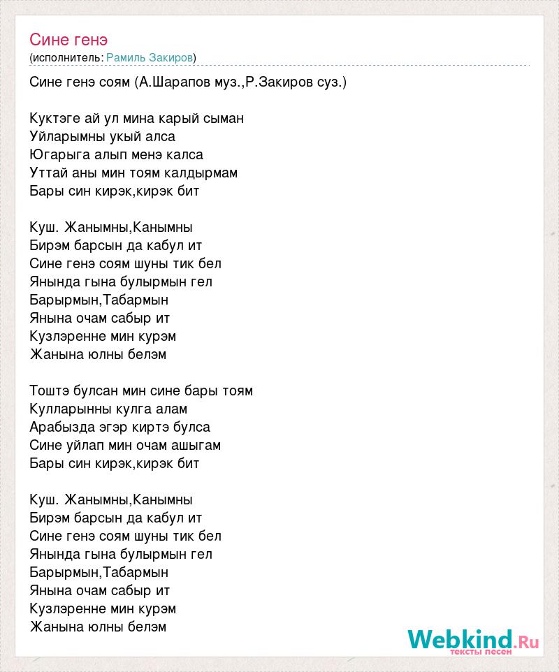 Сине генэ соям (А.Шарапов муз.,Р.Закиров суз.) Куктэге ай ул мина карый сыман Уйларымны укый алса Югарыга алып менэ калса Уттай аны мин тоям калдырмам Бары син кирэк,кирэк бит Куш. Жанымны,Канымны Бирэм барсын да кабул ит Сине генэ соям шуны тик бел Янында гына булырмын гел Барырмын,Табармын Янына очам сабыр ит Кузлэренне мин курэм Жанына юлны белэм Тоштэ булсан мин сине бары тоям Кулларынны кулга алам Арабызда эгэр киртэ булса Сине уйлап мин очам ашыгам Бары син кирэк,кирэк бит Куш. Жанымны,Канымны Бирэм барсын да кабул ит Сине генэ соям шуны тик бел Янында гына булырмын гел Барырмын,Табармын Янына очам сабыр ит Кузлэренне мин курэм Жанына юлны белэм