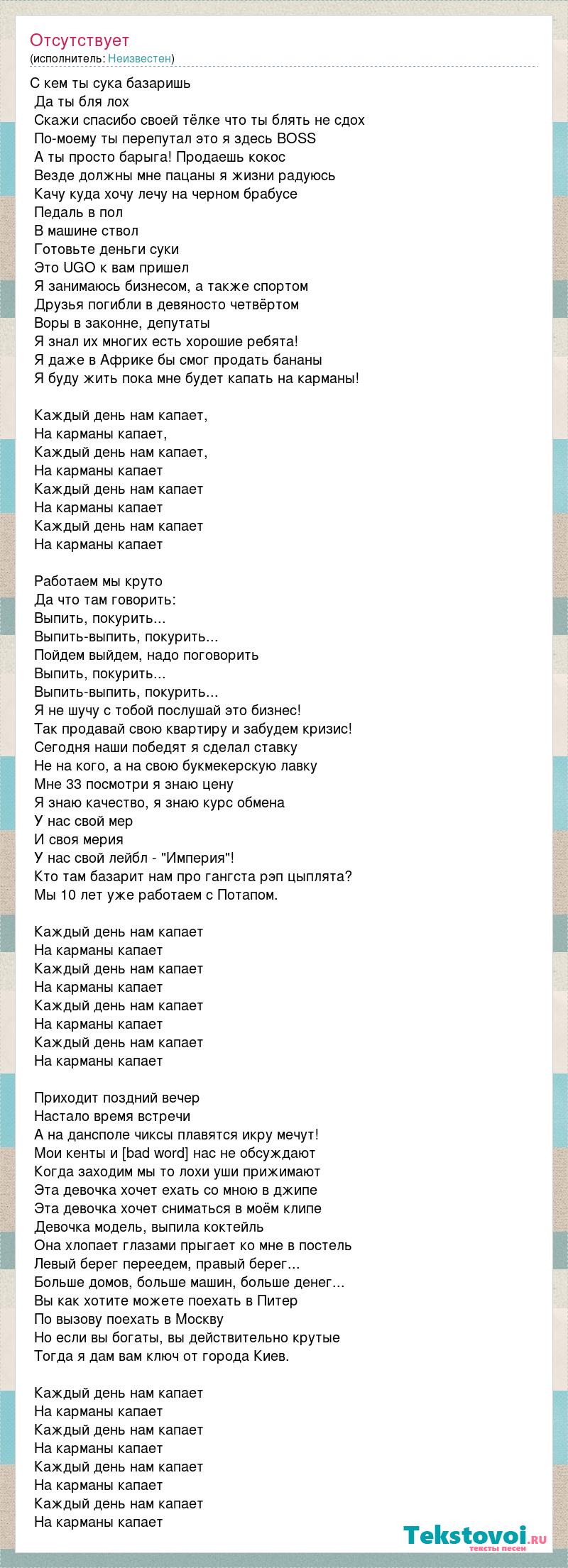 С кем ты сука базаришь Да ты бля лох Скажи спасибо своей тёлке что ты блять не сдох По-моему ты перепутал это я здесь BOSS А ты просто барыга! Продаешь кокос Везде должны мне пацаны я жизни радуюсь Качу куда хочу лечу на черном брабусе Педаль в пол В машине ствол Готовьте деньги суки Это UGO к вам пришел Я занимаюсь бизнесом, а также спортом Друзья погибли в девяносто четвёртом Воры в законне, депутаты Я знал их многих есть хорошие ребята! Я даже в Африке бы смог продать бананы Я буду жить пока мне будет капать на карманы! Каждый день нам капает, На карманы капает, Каждый день нам капает, На карманы капает Каждый день нам капает На карманы капает Каждый день нам капает На карманы капает Работаем мы круто Да что там говорить: Выпить, покурить... Выпить-выпить, покурить... Пойдем выйдем, надо поговорить Выпить, покурить... Выпить-выпить, покурить... Я не шучу с тобой послушай это бизнес! Так продавай свою квартиру и забудем кризис! Сегодня наши победят я сделал ставку Не на кого, а на свою букмекерскую лавку Мне 33 посмотри я знаю цену Я знаю качество, я знаю курс обмена У нас свой мер И своя мерия У нас свой лейбл - "Империя"! Кто там базарит нам про гангста рэп цыплята? Мы 10 лет уже работаем с Потапом. Каждый день нам капает На карманы капает Каждый день нам капает На карманы капает Каждый день нам капает На карманы капает Каждый день нам капает На карманы капает Приходит поздний вечер Настало время встречи А на дансполе чиксы плавятся икру мечут! Мои кенты и [bad word] нас не обсуждают Когда заходим мы то лохи уши прижимают Эта девочка хочет ехать со мною в джипе Эта девочка хочет сниматься в моём клипе Девочка модель, выпила коктейль Она хлопает глазами прыгает ко мне в постель Левый берег переедем, правый берег... Больше домов, больше машин, больше денег... Вы как хотите можете поехать в Питер По вызову поехать в Москву Но если вы богаты, вы действительно крутые Тогда я дам вам ключ от города Киев. Каждый день нам капает На карманы капает Каждый день нам капает На карманы капает Каждый день нам капает На карманы капает Каждый день нам капает На карманы капает