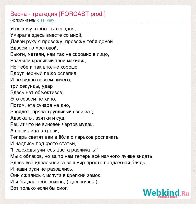 Я не хочу чтобы ты сегодня, Умирала здесь вместе со мной, Давай руку я провожу, провожу тебя домой. Вдвоём по мостовой, Вьюги, метели, нам так не скромно в лицо, Размыли красивый твой макияж, Но тебе и так вполне хорошо. Вдруг черный пежо ослепил, И не видно совсем ничего, три секунды, удар Здесь нет объективов, Это совсем не кино. Потом, эта сучара на дно, Засядет, пряча трусливый свой зад, Адвокаты, взятки и суд, Решит что не виновен чертов мудак. А наши лица в крови, Теперь светят вам в ёбла с ларьков роспечать И надпись под фото статьи, "Пешеходы учитесь цвета различать!" Мы с облаков, но за то нам теперь всё намного лучше видать Здесь всё идеальней, а ваш мир просто продажная блядь. И наши руки не разошлись, Они сжались с испуга в крепкий замок, И я бы дал тебе жизнь, ( дал жизнь ) Вот только если бы смог.