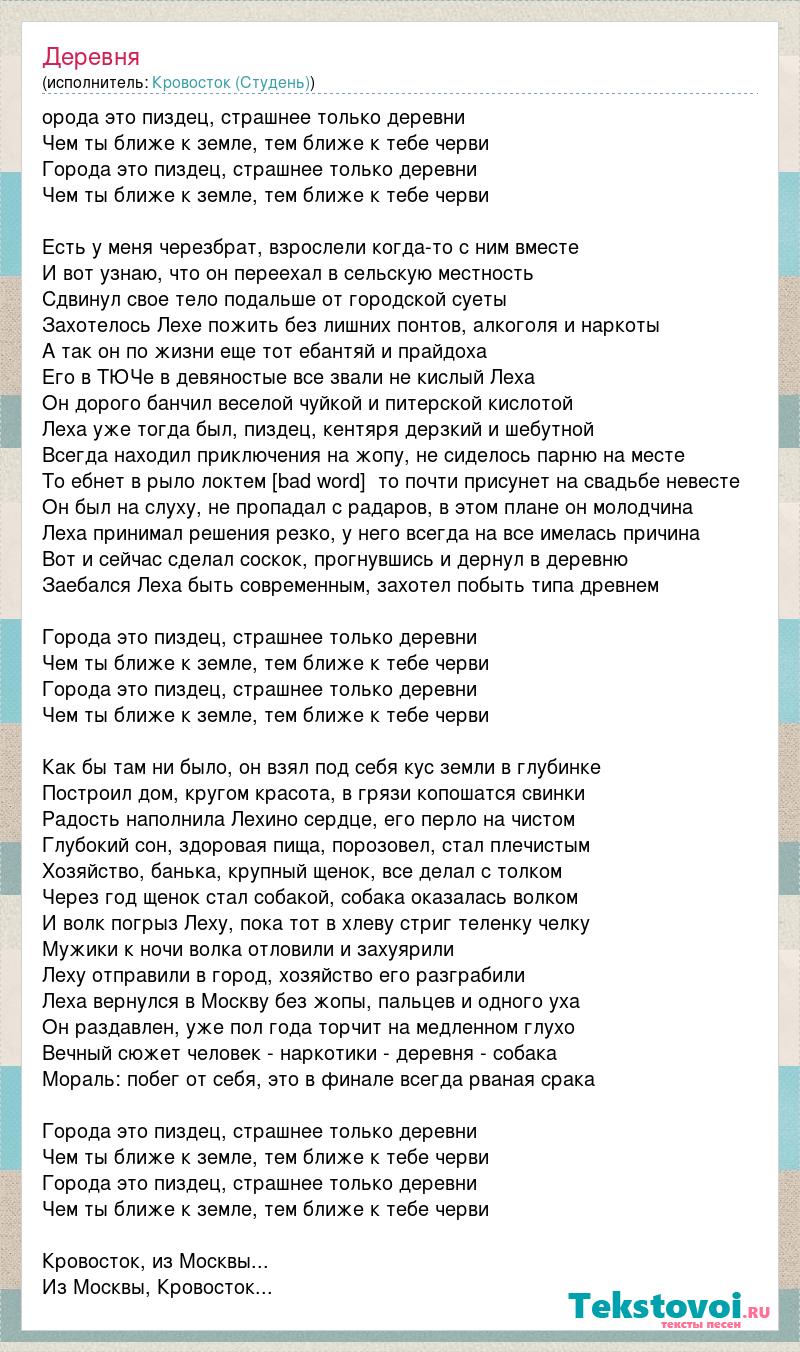 орода это пиздец, страшнее только деревни Чем ты ближе к земле, тем ближе к тебе черви Города это пиздец, страшнее только деревни Чем ты ближе к земле, тем ближе к тебе черви Есть у меня черезбрат, взрослели когда-то с ним вместе И вот узнаю, что он переехал в сельскую местность Сдвинул свое тело подальше от городской суеты Захотелось Лехе пожить без лишних понтов, алкоголя и наркоты А так он по жизни еще тот ебантяй и прайдоха Его в ТЮЧе в девяностые все звали не кислый Леха Он дорого банчил веселой чуйкой и питерской кислотой Леха уже тогда был, пиздец, кентяря дерзкий и шебутной Всегда находил приключения на жопу, не сиделось парню на месте То ебнет в рыло локтем [bad word] то почти присунет на свадьбе невесте Он был на слуху, не пропадал с радаров, в этом плане он молодчина Леха принимал решения резко, у него всегда на все имелась причина Вот и сейчас сделал соскок, прогнувшись и дернул в деревню Заебался Леха быть современным, захотел побыть типа древнем Города это пиздец, страшнее только деревни Чем ты ближе к земле, тем ближе к тебе черви Города это пиздец, страшнее только деревни Чем ты ближе к земле, тем ближе к тебе черви Как бы там ни было, он взял под себя кус земли в глубинке Построил дом, кругом красота, в грязи копошатся свинки Радость наполнила Лехино сердце, его перло на чистом Глубокий сон, здоровая пища, порозовел, стал плечистым Хозяйство, банька, крупный щенок, все делал с толком Через год щенок стал собакой, собака оказалась волком И волк погрыз Леху, пока тот в хлеву стриг теленку челку Мужики к ночи волка отловили и захуярили Леху отправили в город, хозяйство его разграбили Леха вернулся в Москву без жопы, пальцев и одного уха Он раздавлен, уже пол года торчит на медленном глухо Вечный сюжет человек - наркотики - деревня - собака Мораль: побег от себя, это в финале всегда рваная срака Города это пиздец, страшнее только деревни Чем ты ближе к земле, тем ближе к тебе черви Города это пиздец, страшнее только деревни Чем ты ближе к земле, тем ближе к тебе черви Кровосток, из Москвы... Из Москвы, Кровосток...