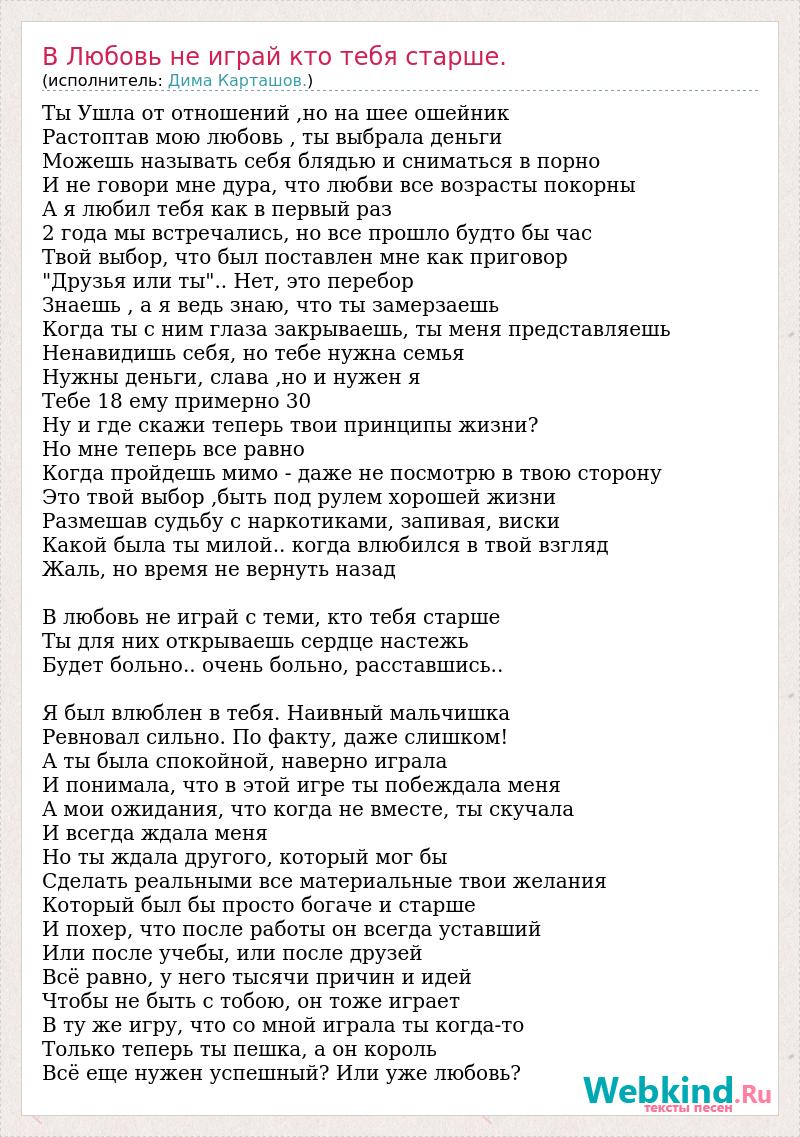 Ты Ушла от отношений ,но на шее ошейник Растоптав мою любовь , ты выбрала деньги Можешь называть себя блядью и сниматься в порно И не говори мне дура, что любви все возрасты покорны А я любил тебя как в первый раз 2 года мы встречались, но все прошло будто бы час Твой выбор, что был поставлен мне как приговор "Друзья или ты".. Нет, это перебор Знаешь , а я ведь знаю, что ты замерзаешь Когда ты с ним глаза закрываешь, ты меня представляешь Ненавидишь себя, но тебе нужна семья Нужны деньги, слава ,но и нужен я Тебе 18 ему примерно 30 Ну и где скажи теперь твои принципы жизни? Но мне теперь все равно Когда пройдешь мимо - даже не посмотрю в твою сторону Это твой выбор ,быть под рулем хорошей жизни Размешав судьбу с наркотиками, запивая, виски Какой была ты милой.. когда влюбился в твой взгляд Жаль, но время не вернуть назад В любовь не играй с теми, кто тебя старше Ты для них открываешь сердце настежь Будет больно.. очень больно, расставшись.. Я был влюблен в тебя. Наивный мальчишка Ревновал сильно. По факту, даже слишком! А ты была спокойной, наверно играла И понимала, что в этой игре ты побеждала меня А мои ожидания, что когда не вместе, ты скучала И всегда ждала меня Но ты ждала другого, который мог бы Сделать реальными все материальные твои желания Который был бы просто богаче и старше И похер, что после работы он всегда уставший Или после учебы, или после друзей Всё равно, у него тысячи причин и идей Чтобы не быть с тобою, он тоже играет В ту же игру, что со мной играла ты когда-то Только теперь ты пешка, а он король Всё еще нужен успешный? Или уже любовь?