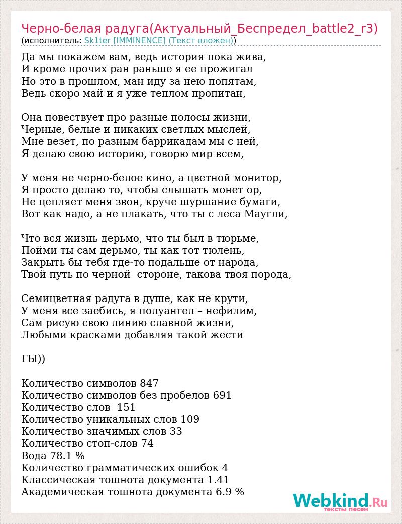 Да мы покажем вам, ведь история пока жива, И кроме прочих ран раньше я ее прожигал Но это в прошлом, ман иду за нею попятам, Ведь скоро май и я уже теплом пропитан, Она повествует про разные полосы жизни, Черные, белые и никаких светлых мыслей, Мне везет, по разным баррикадам мы с ней, Я делаю свою историю, говорю мир всем, У меня не черно-белое кино, а цветной монитор, Я просто делаю то, чтобы слышать монет ор, Не цепляет меня звон, круче шуршание бумаги, Вот как надо, а не плакать, что ты с леса Маугли, Что вся жизнь дерьмо, что ты был в тюрьме, Пойми ты сам дерьмо, ты как тот тюлень, Закрыть бы тебя где-то подальше от народа, Твой путь по черной стороне, такова твоя порода, Семицветная радуга в душе, как не крути, У меня все заебись, я полуангел – нефилим, Сам рисую свою линию славной жизни, Любыми красками добавляя такой жести ГЫ)) Количество символов 847 Количество символов без пробелов 691 Количество слов 151 Количество уникальных слов 109 Количество значимых слов 33 Количество стоп-слов 74 Вода 78.1 % Количество грамматических ошибок 4 Классическая тошнота документа 1.41 Академическая тошнота документа 6.9 %