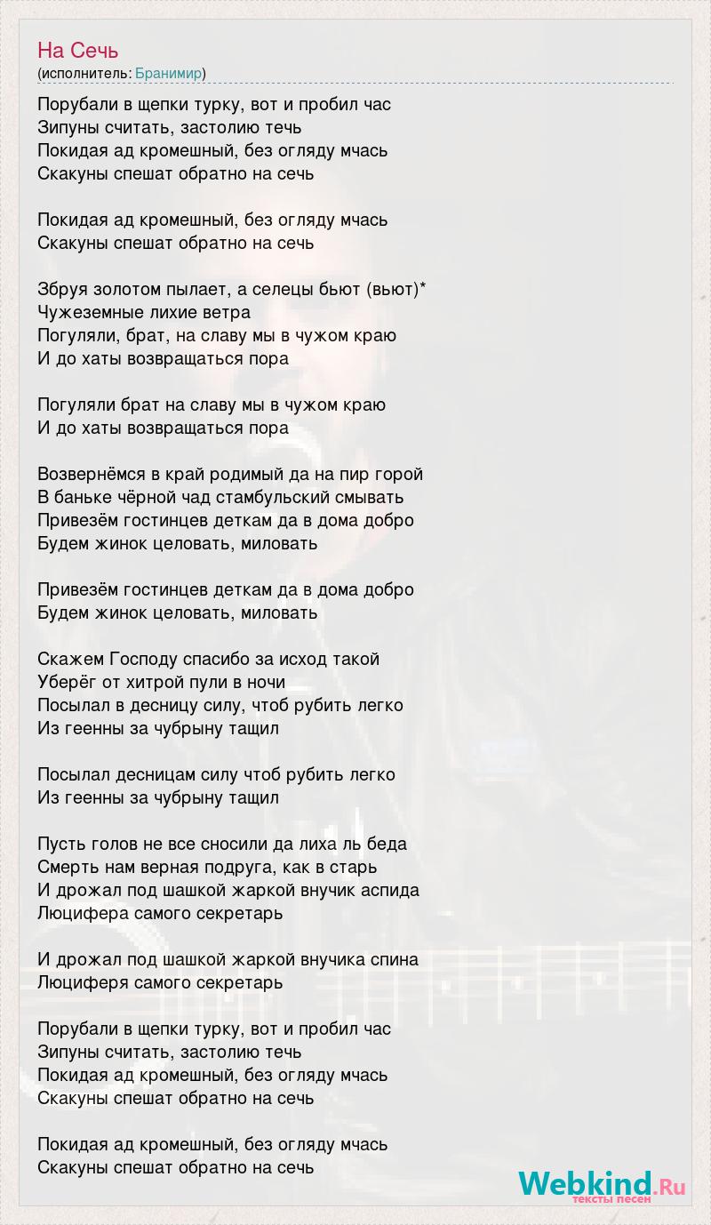 Порубали в щепки турку, вот и пробил час Зипуны считать, застолию течь Покидая ад кромешный, без огляду мчась Скакуны спешат обратно на сечь Покидая ад кромешный, без огляду мчась Скакуны спешат обратно на сечь Збруя золотом пылает, а селецы бьют (вьют)* Чужеземные лихие ветра Погуляли, брат, на славу мы в чужом краю И до хаты возвращаться пора Погуляли брат на славу мы в чужом краю И до хаты возвращаться пора Возвернёмся в край родимый да на пир горой В баньке чёрной чад стамбульский смывать Привезём гостинцев деткам да в дома добро Будем жинок целовать, миловать Привезём гостинцев деткам да в дома добро Будем жинок целовать, миловать Скажем Господу спасибо за исход такой Уберёг от хитрой пули в ночи Посылал в десницу силу, чтоб рубить легко Из геенны за чубрыну тащил Посылал десницам силу чтоб рубить легко Из геенны за чубрыну тащил Пусть голов не все сносили да лиха ль беда Смерть нам верная подруга, как в старь И дрожал под шашкой жаркой внучик аспида Люцифера самого секретарь И дрожал под шашкой жаркой внучика спина Люциферя самого секретарь Порубали в щепки турку, вот и пробил час Зипуны считать, застолию течь Покидая ад кромешный, без огляду мчась Скакуны спешат обратно на сечь Покидая ад кромешный, без огляду мчась Скакуны спешат обратно на сечь