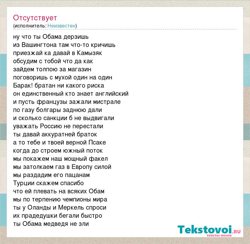 ну что ты Обама дерзишь из Вашингтона там что-то кричишь приезжай ка давай в Камызяк обсудим с тобой что да как зайдем толпою за магазин поговоришь с мухой один на один Барак! братан ни какого риска он единственный кто знает английский и пусть французы зажали мистрале по газу болгары заднюю дали и сколько санкции б не выдвигали уважать Россию не перестали ты давай аккуратней браток а то тебе и твоей верной Псаке когда до строем южный поток мы покажем наш мощный факел мы затолкаем газ в Европу силой мы раздадим его пацанам Турции скажем спасибо что ей плевать на всяких Обам мы по терпению чемпионы мира ты у Оланды и Меркель спроси их прадедушки бегали быстро ты Обама медведя не зли
