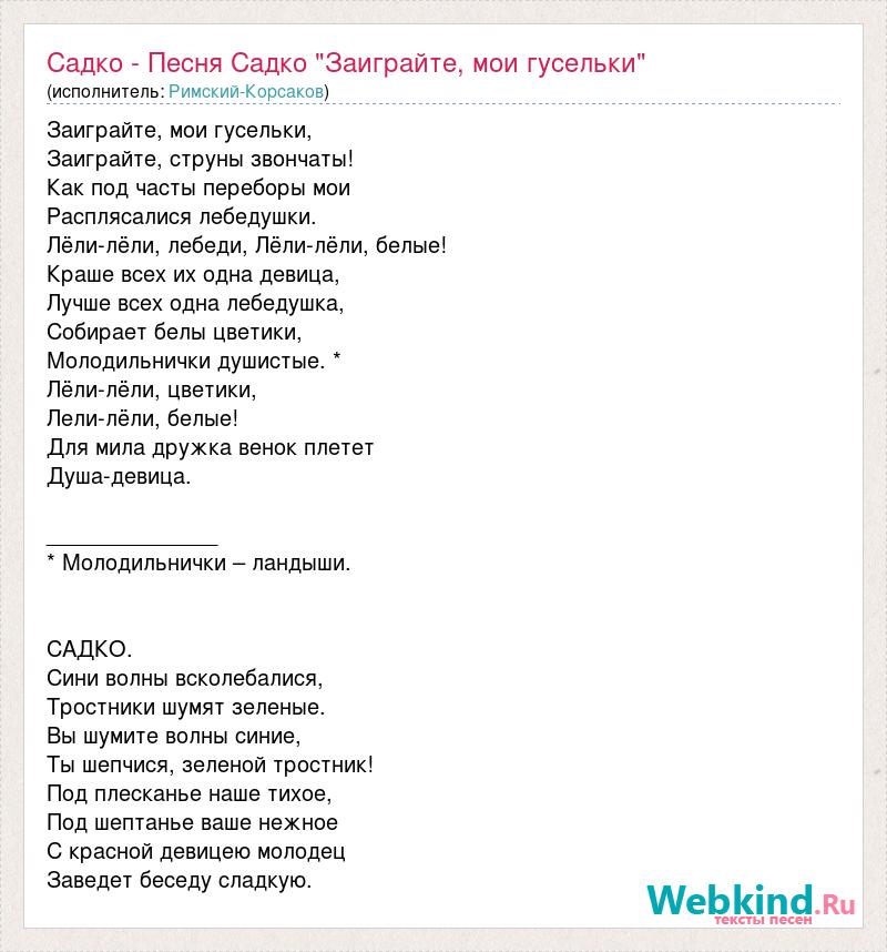 Заиграйте, мои гусельки, Заиграйте, струны звончаты! Как под часты переборы мои Расплясалися лебедушки. Лёли-лёли, лебеди, Лёли-лёли, белые! Краше всех их одна девица, Лучше всех одна лебедушка, Собирает белы цветики, Молодильнички душистые. * Лёли-лёли, цветики, Лели-лёли, белые! Для мила дружка венок плетет Душа-девица. ______________ * Молодильнички – ландыши. САДКО. Сини волны всколебалися, Тростники шумят зеленые. Вы шумите волны синие, Ты шепчися, зеленой тростник! Под плесканье наше тихое, Под шептанье ваше нежное С красной девицею молодец Заведет беседу сладкую.